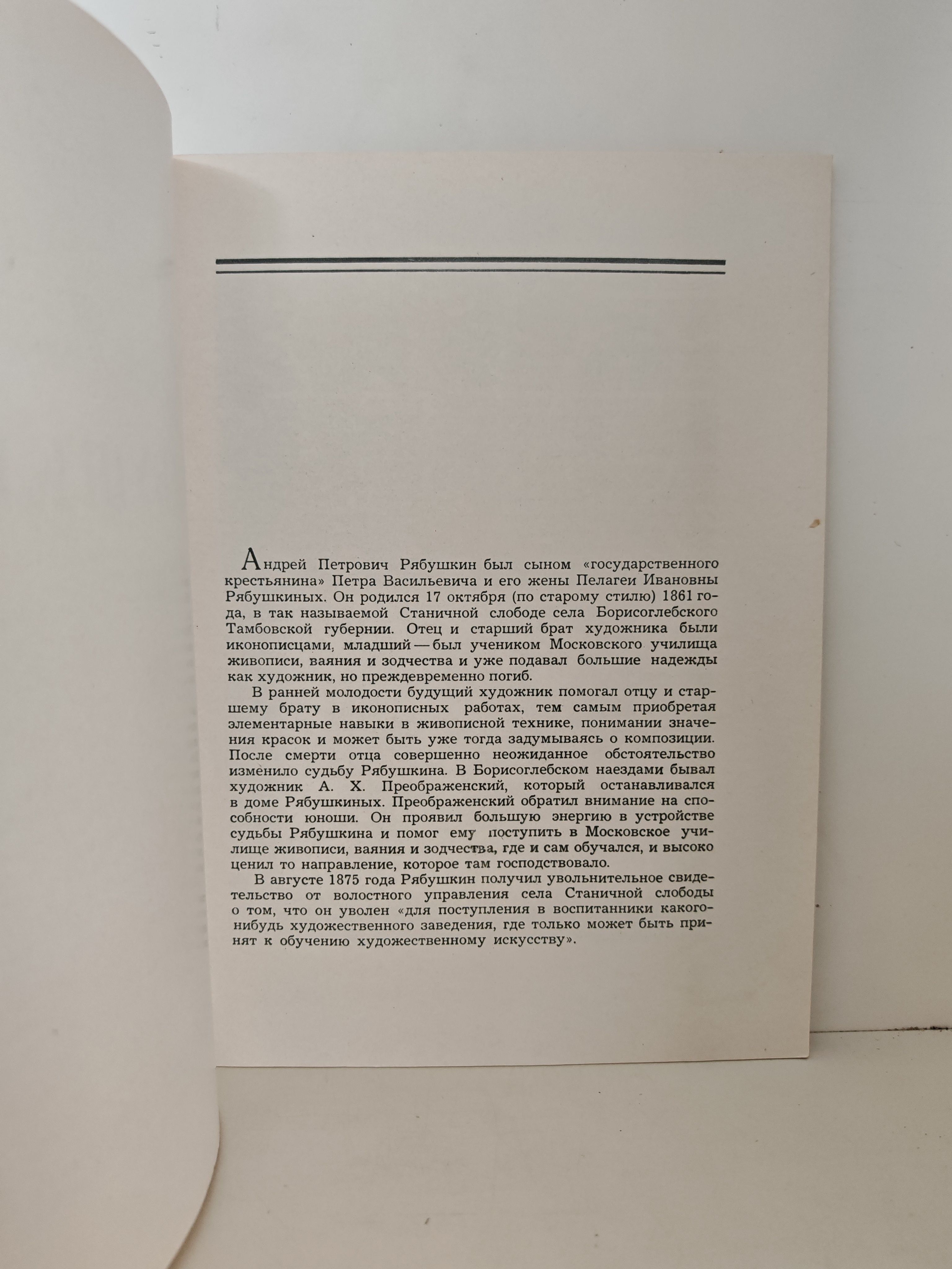 Книга выпущена в 1960 году Государственным издательством изобразительного искусства в рамках популяризации наследия русских художников. Издание приурочено к переоценке и сохранению памяти о мастерах рубежа XIX–XX веков, чьи работы не всегда получали должное признание в первые десятилетия советской власти. Андрей Рябушкин, несмотря на сравнительно короткий творческий путь (около 15 лет), оставил значительное художественное наследие — десятки картин, сотни этюдов и рисунков. Альбом стал частью просветительской миссии, направленной на знакомство широкой аудитории с одним из ведущих русских живописцев того времени. Ретроспективные выставки работ Рябушкина, прошедшие в 1961 году в Москве и Ленинграде, также способствовали актуализации интереса к его творчеству.