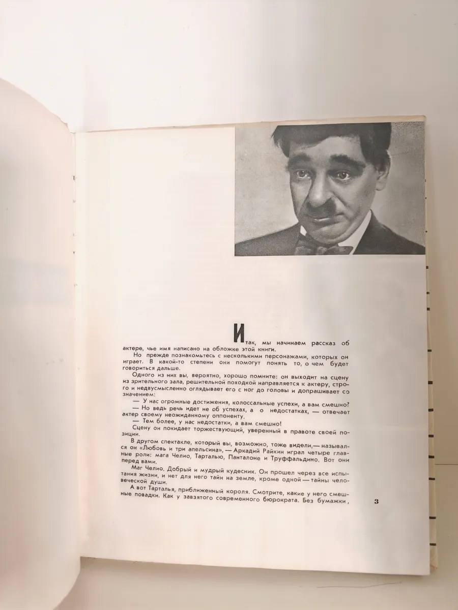 Книга посвящена жизни и творчеству выдающегося советского актёра, конферансье, театрального режиссёра и юмориста Аркадия Райкина. В издании представлен не только рассказ об актёре, но и анализ его значительных работ. Автор акцентирует внимание на мастерстве перевоплощения Райкина, его выразительном взгляде и добродушной улыбке. Фотографии служат основным средством иллюстрации, однако, как отмечается, они не могут в полной мере передать голос и уникальное мастерство актёра. Книга помогает «проникнуть в тайны мастерства» А. Райкина, показать особенности его творчества.