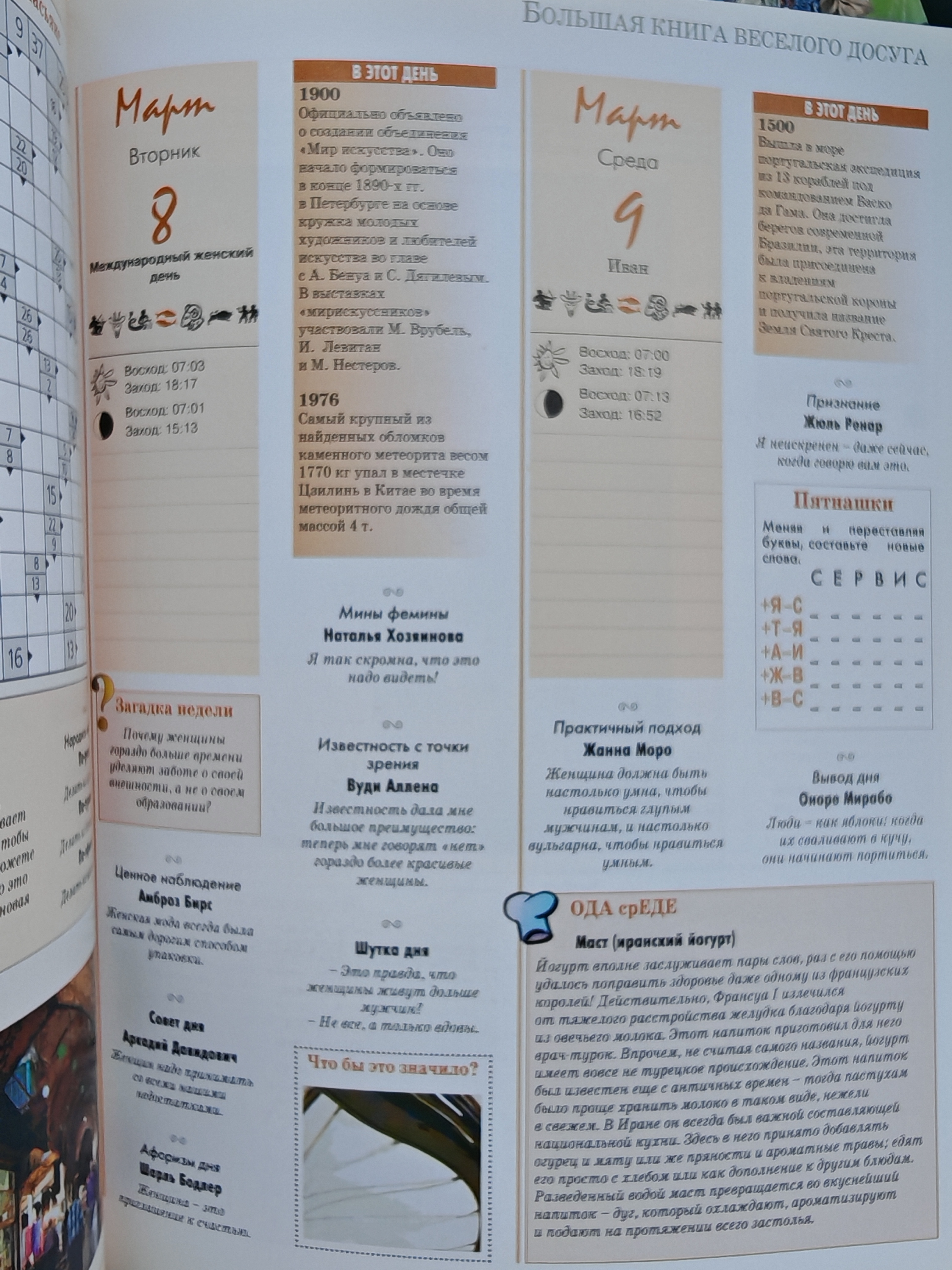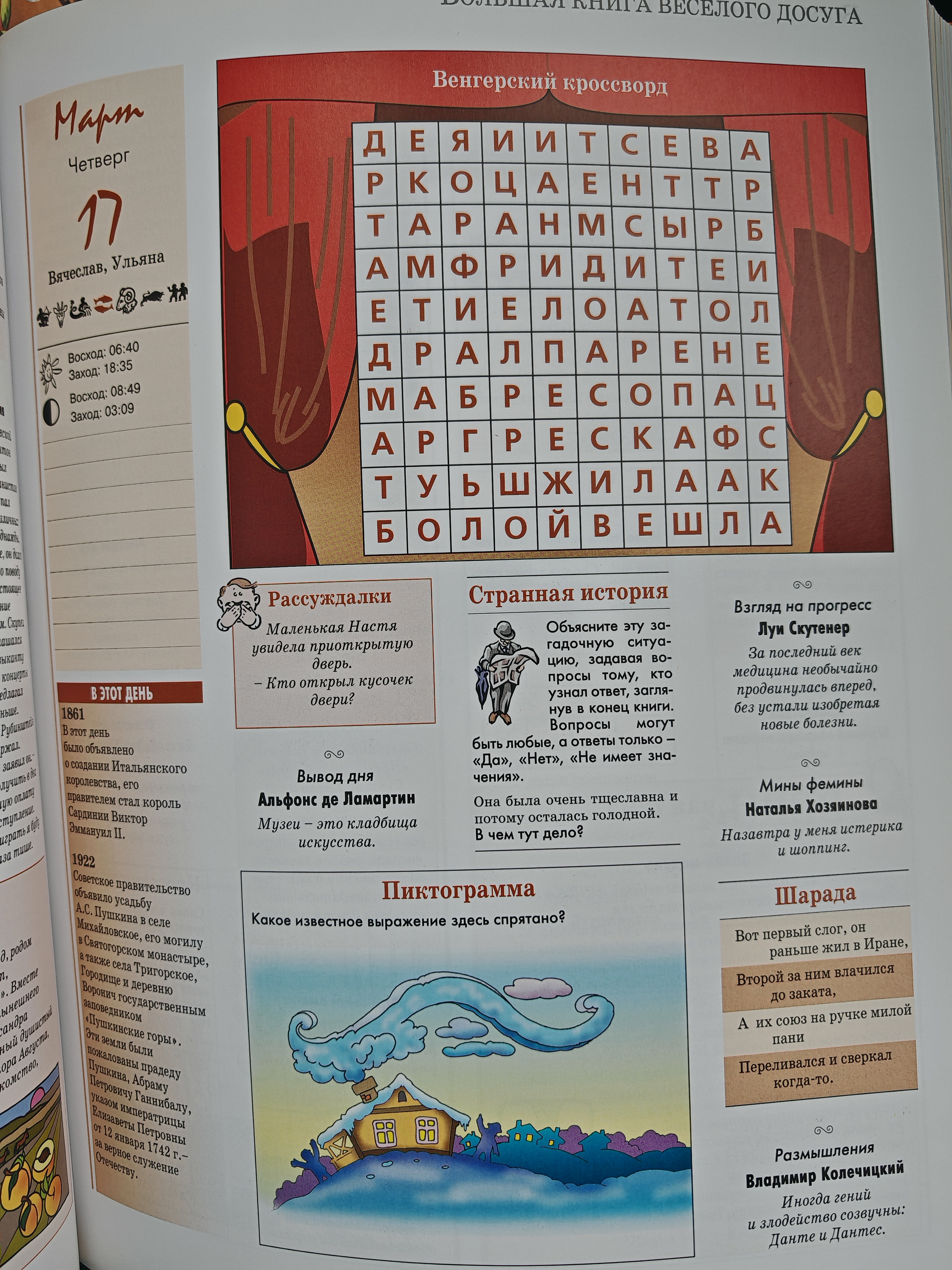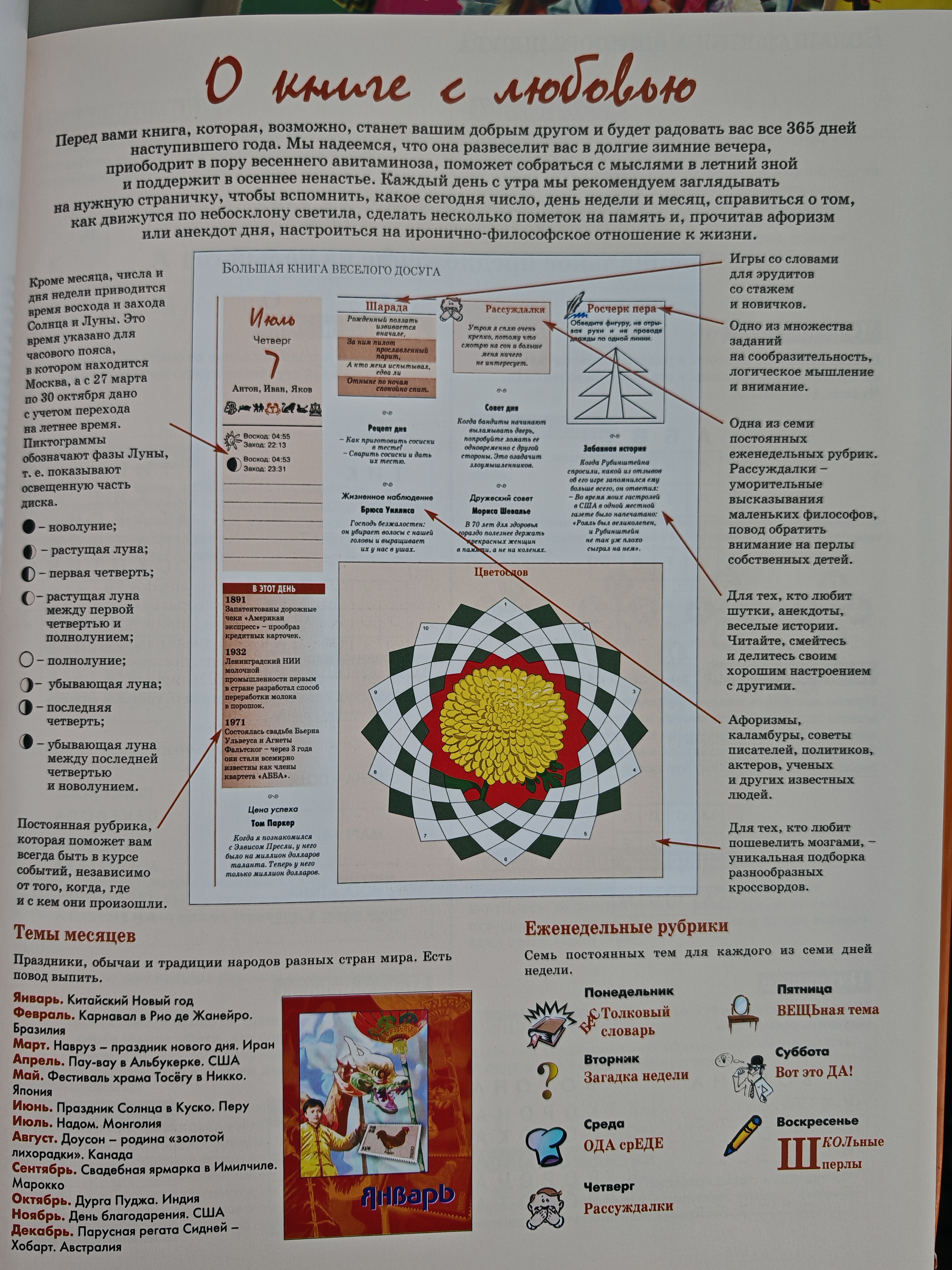 Настоящий подарок для всей семьи: книга с забавными, интересными и полезными заданиями для читателей всех возрастов. Содержит: — игры со словами (гетерограммы, анаграммы, палиндромы, шарады, шароиды); — логические игры, задачи и головоломки; — детективные задачи; — кроссворды, чайнворды, сканворды и новые задания; — афоризмы, анекдоты, каламбуры и шутки; — задания распределены на каждый день календаря; — ежемесячное описание праздников, обычаев и традиций разных стран; — каждая неделя посвящена определённой теме. Книга подарит хорошее настроение и разнообразит повседневную жизнь на все 365 дней в году.