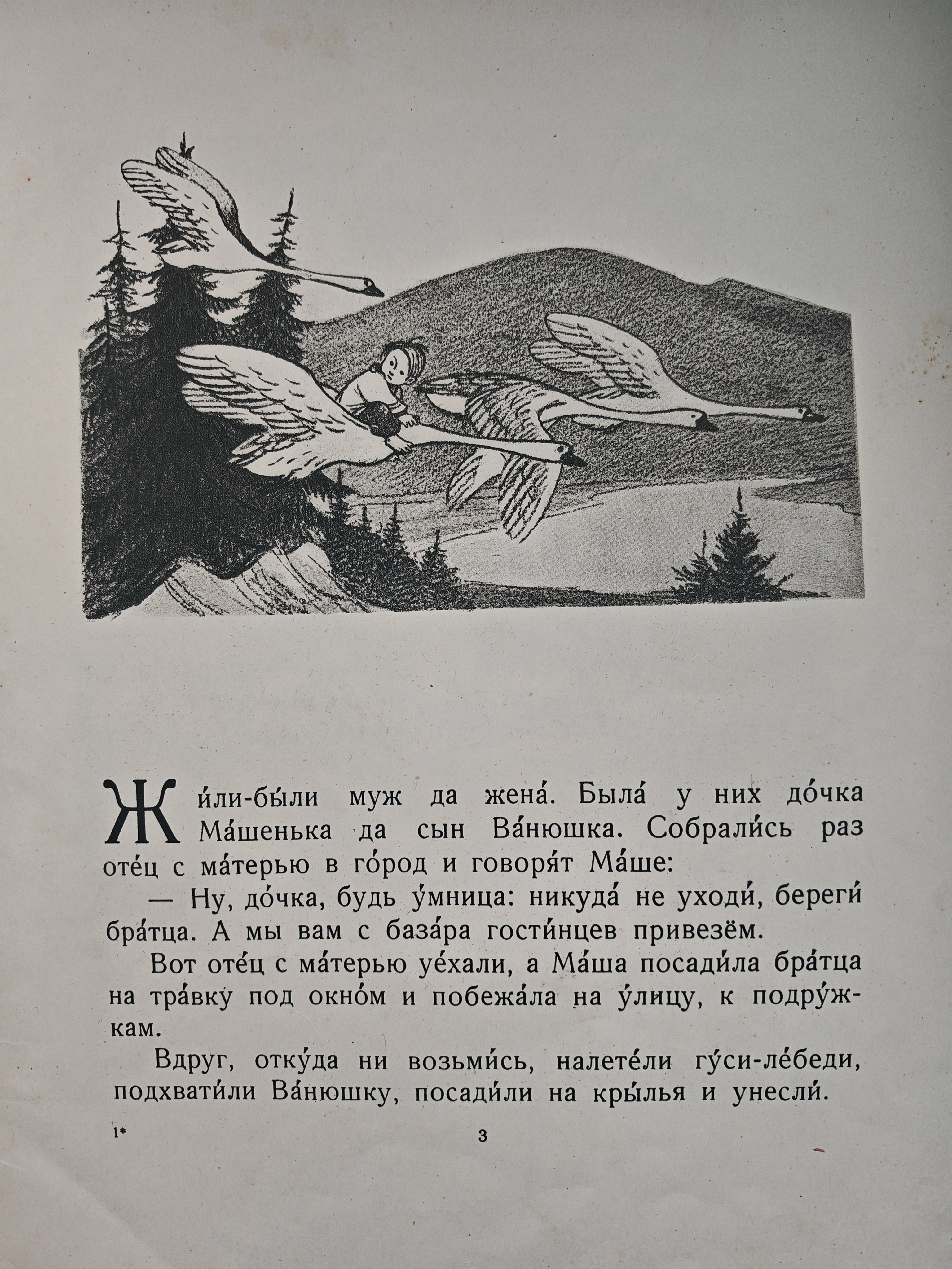 Русская народная сказка в обработке М. А. Булатова. Сюжет: родители ненадолго отлучились, оставив дочь Машеньку присматривать за младшим братом Ванюшкой. Пока родителей не было дома, гуси-лебеди похитили малыша и унесли к Бабе-яге. Машенька отправляется на поиски брата, преодолевает множество трудностей и с помощью волшебных персонажей (печки, яблони, речки, ёжика) спасает Ванюшку. Преодолевая препятствия, девочка учится слушаться взрослых и исправлять свои ошибки. Сказка учит взаимовыручке, ответственности и смелости.
