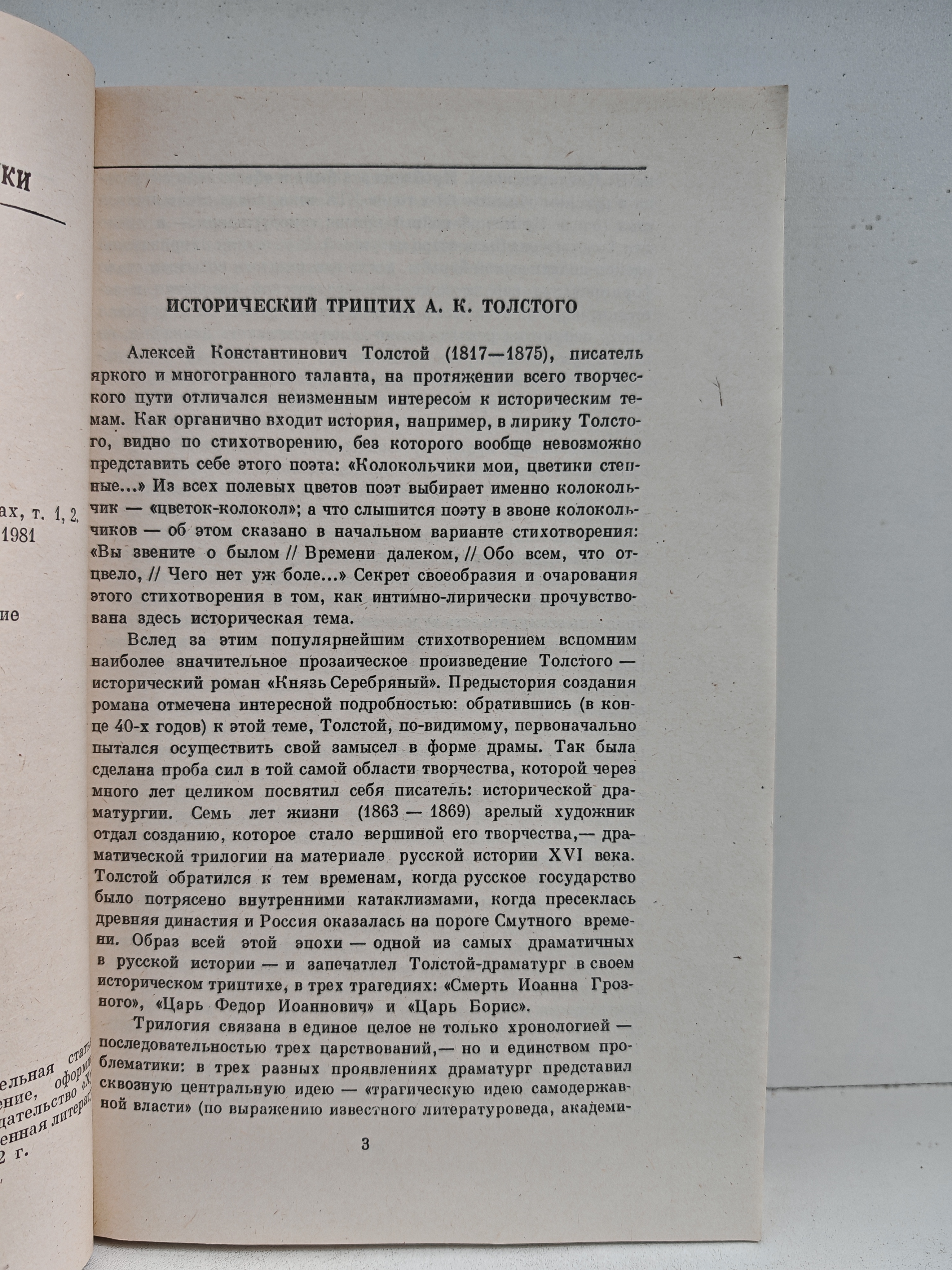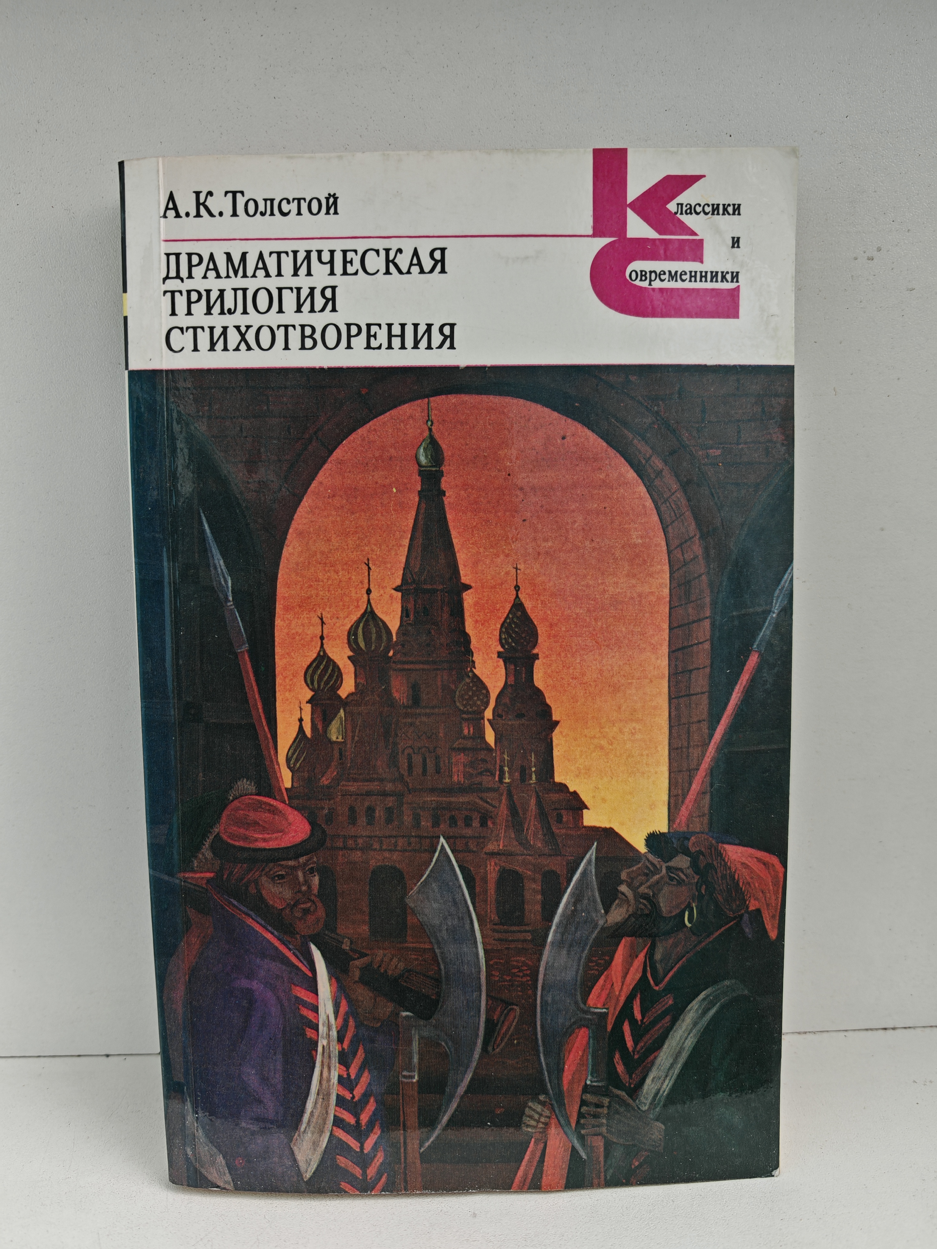 В драматической трилогии А. К. Толстого (1817–1875) представлены пьесы: «Смерть Иоанна Грозного» (1862–1864), «Царь Фёдор Иоаннович» (1864–1868) и «Царь Борис» (1868–1869). В этих произведениях изображена трагедия трёх царствований конца XVI — начала XVII века, показано губительное воздействие неограниченной самодержавной тирании на психологию государственных деятелей и нравы их подданных. Помимо трилогии, в книгу вошли избранные стихотворения поэта.