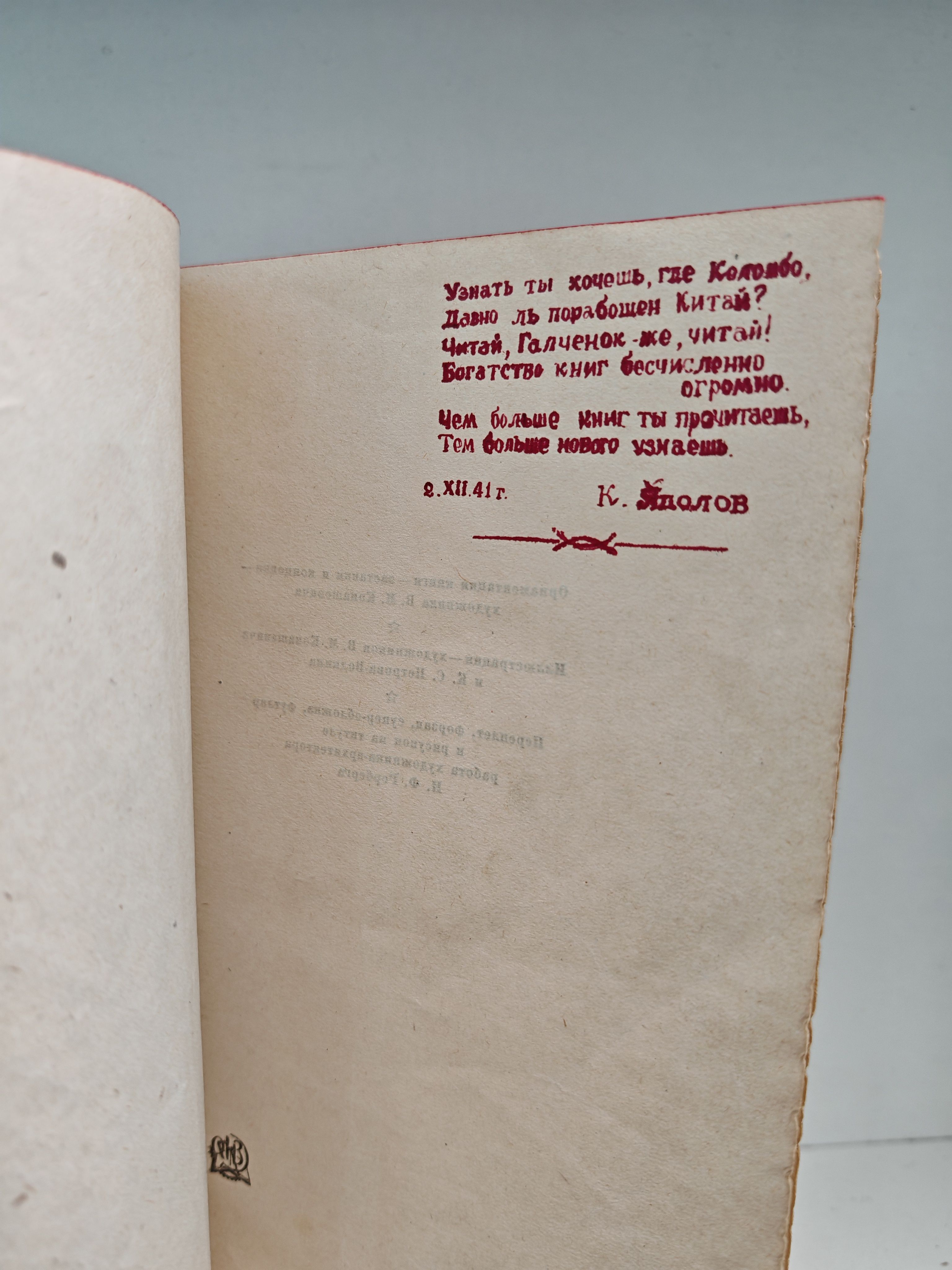 Состояние: Хорошее, изящный переплет с блинтовым тиснением немного потерт, а корешке тиснение синей краской нанесенном квадрате (стертое по центру), на титульном листе дарственная надпись, датированная 1941 годом