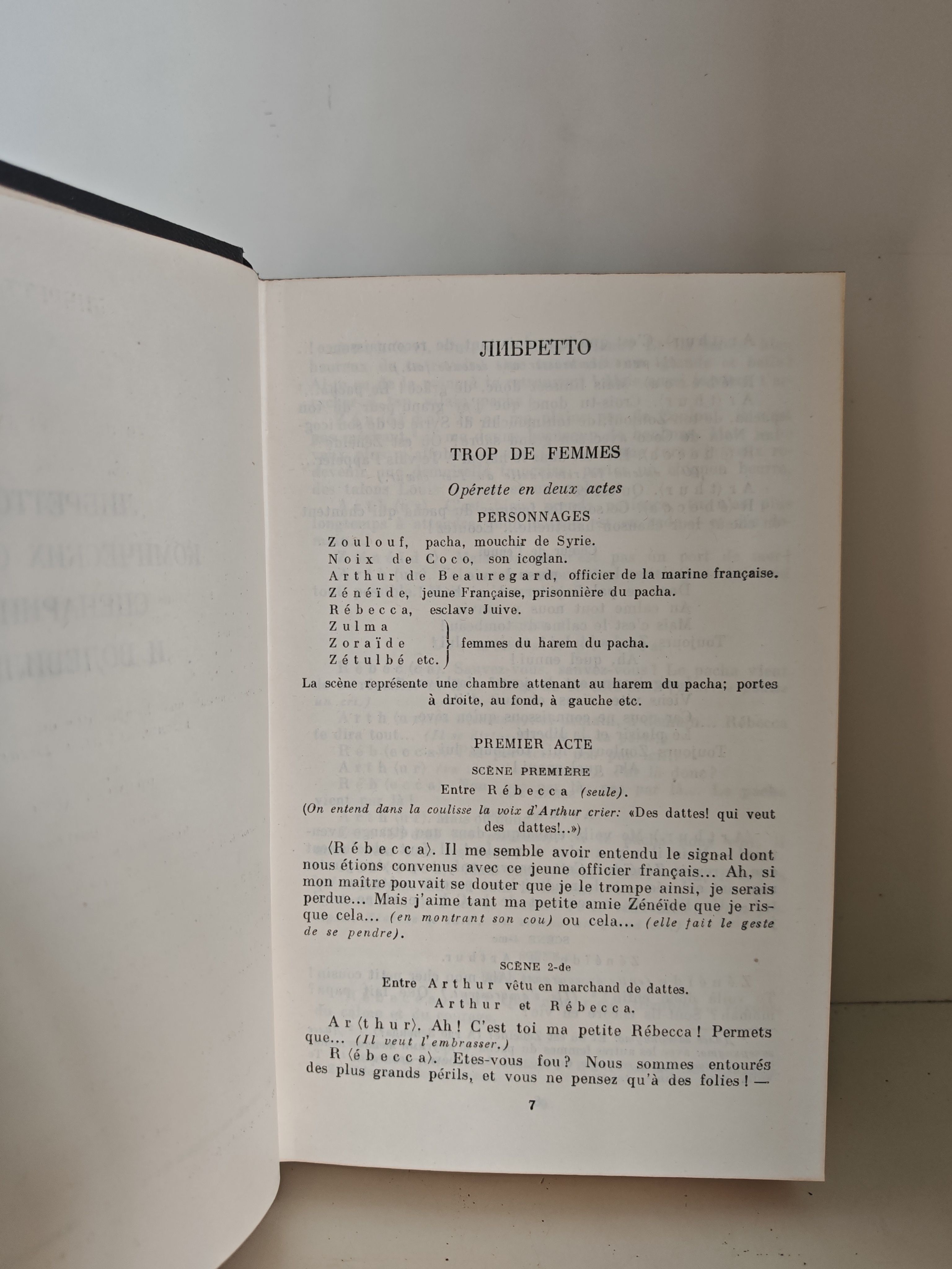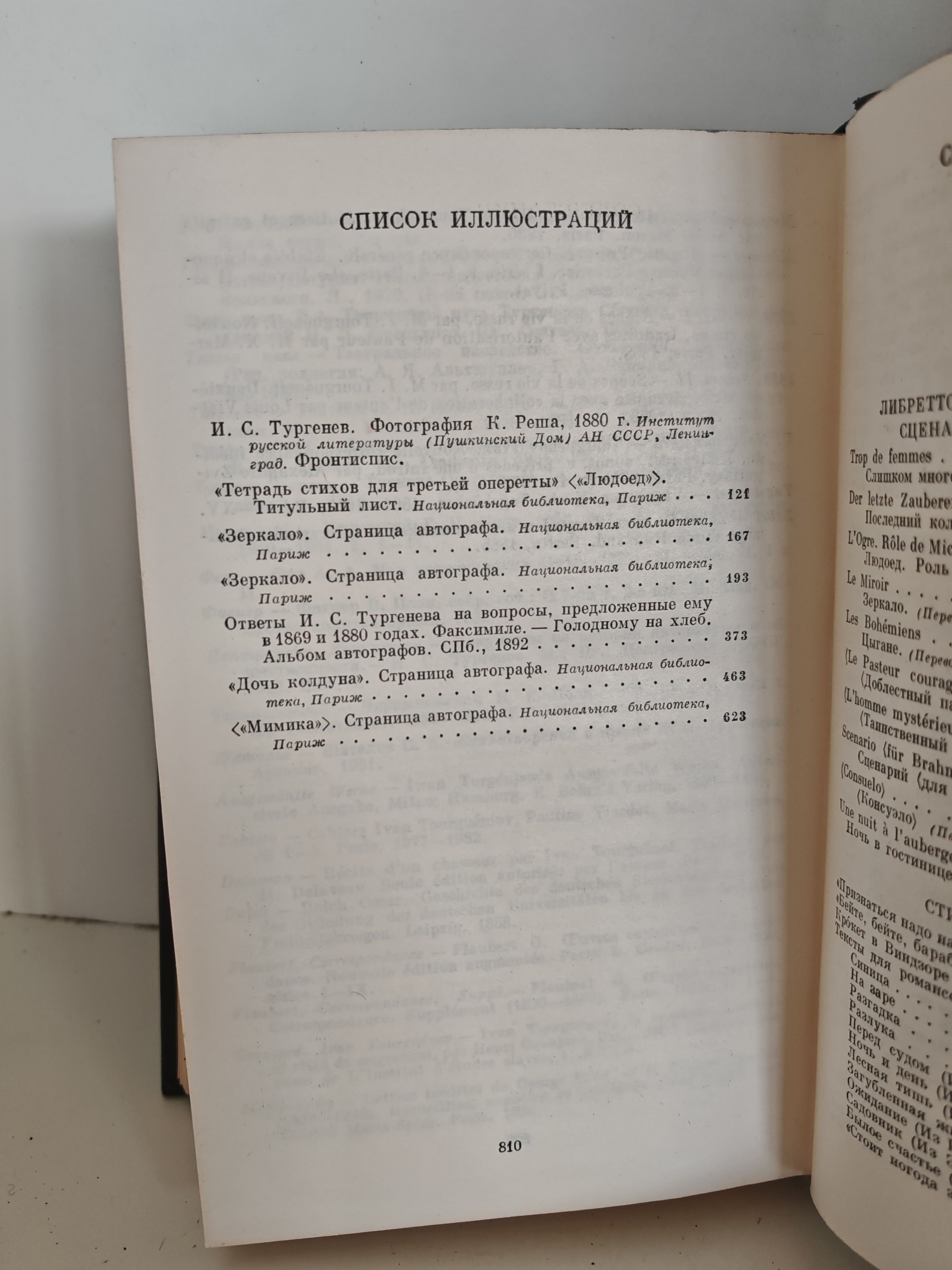 - либретто комических опер (включая «Trop de femmes» («Слишком много жен»), «Der letzte Zauberer» («Последний колдун») и другие) — ранние драматургические опыты Тургенева, написанные преимущественно на французском языке для домашних спектаклей;