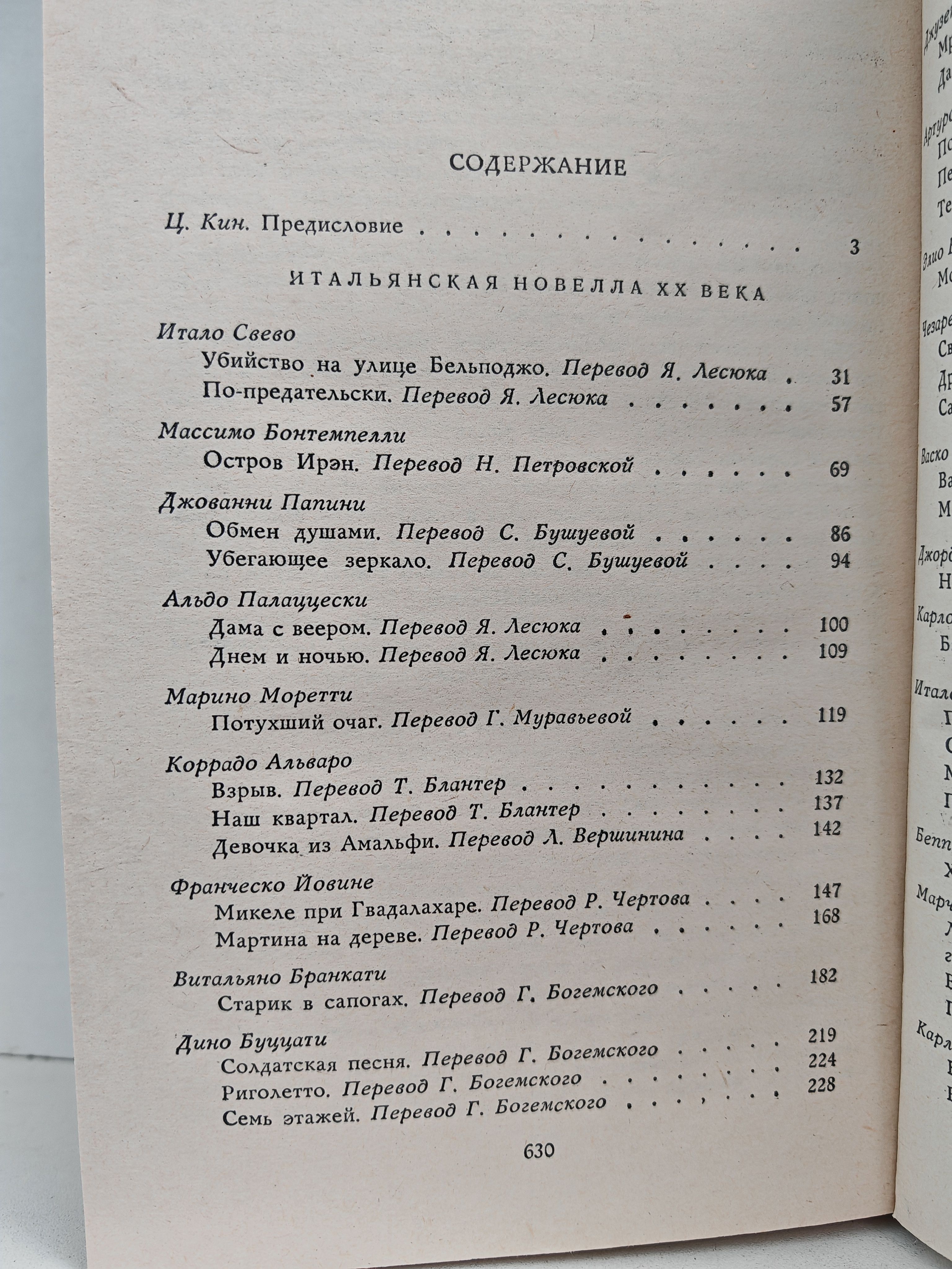 В сборнике представлены лучшие образцы прогрессивной итальянской литературы XX века: Итало Свево "Убийство на улице Бельподжо", "По-предательски", Массимо Бонтемпелли "Остров Ирэн", Джованни Папини "Обмен душами", "Убегающее зеркало", Альдо Палаццески "Дама с веером", "Днем и ночью", Мариино Моретти "Потухший очаг" и многие другие.