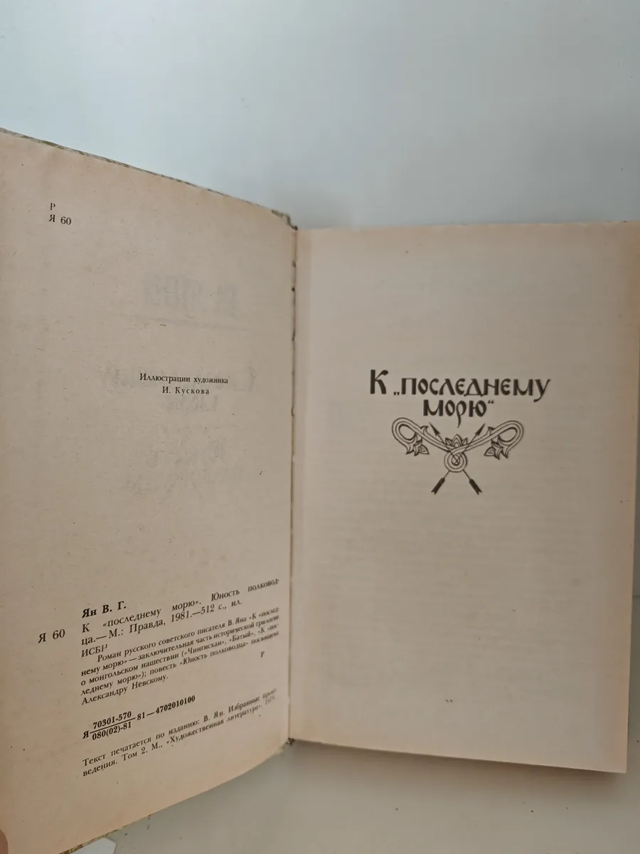 Роман русского советского писателя В.Яна К ПОСЛЕДНЕМУ МОРЮ -заключительная часть исторической трилогии о монгольском нашествии ("Чингисхан", "Батый", К ПОСЛЕДНЕМУ МОРЮ); повесть "Юность полководца" посвящена Александру Невскому.