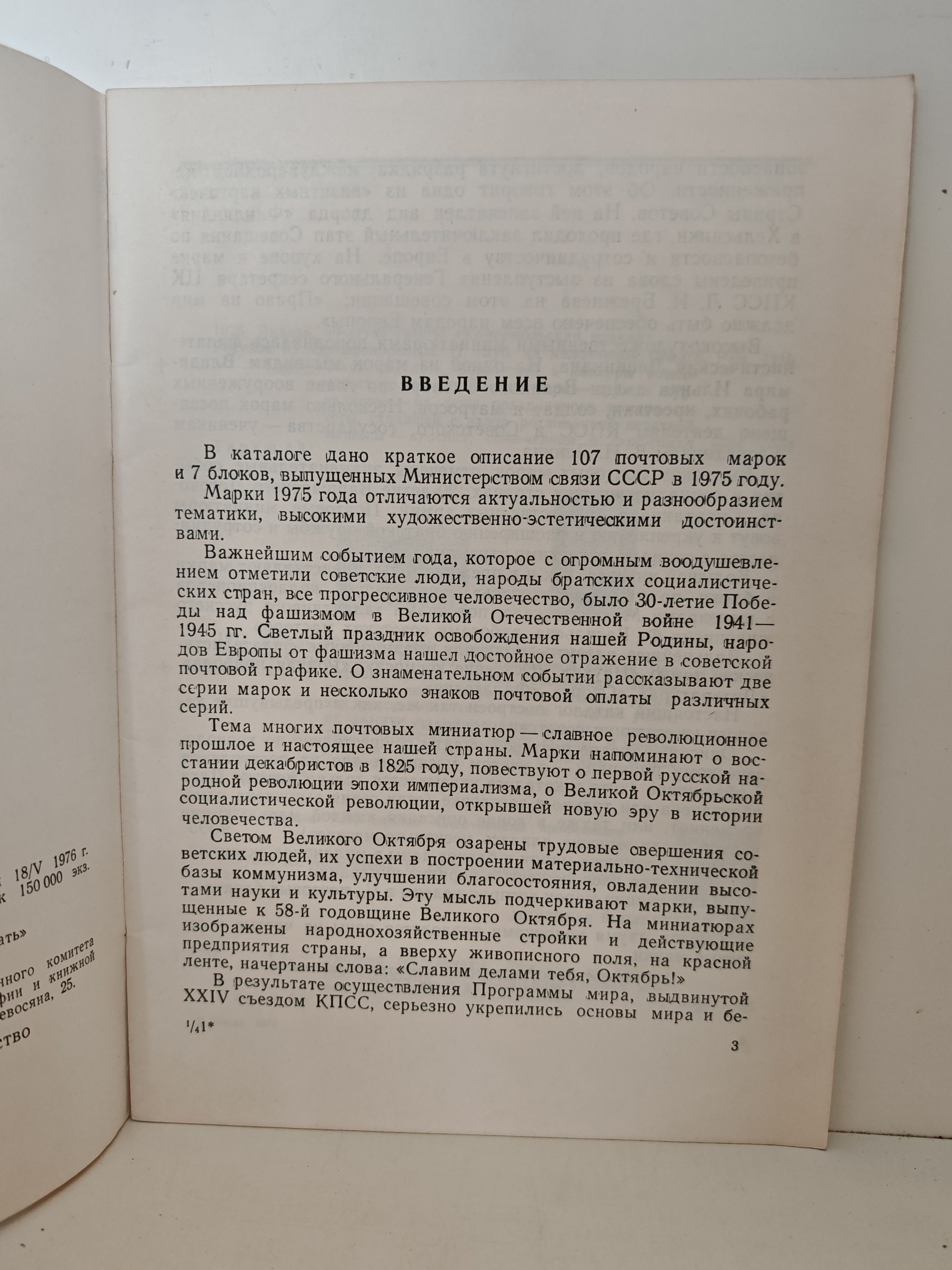 Каталог представляет собой справочное издание для филателистов, содержащее подробное описание почтовых марок и блоков, выпущенных в СССР в 1975 году. Включает информацию о дате выпуска, номинале, тираже и тематике каждой марки. Содержит чёрно-белые иллюстрации, условные сокращения (например, «п. выс.» — печать высокая, «п. глуб.» — печать глубокая, «греб.» — гребенчатая зубцовка и др.), а также данные о типах зубцовки и способах печати. Предназначен для коллекционеров, исследователей и любителей почтовой истории СССР.