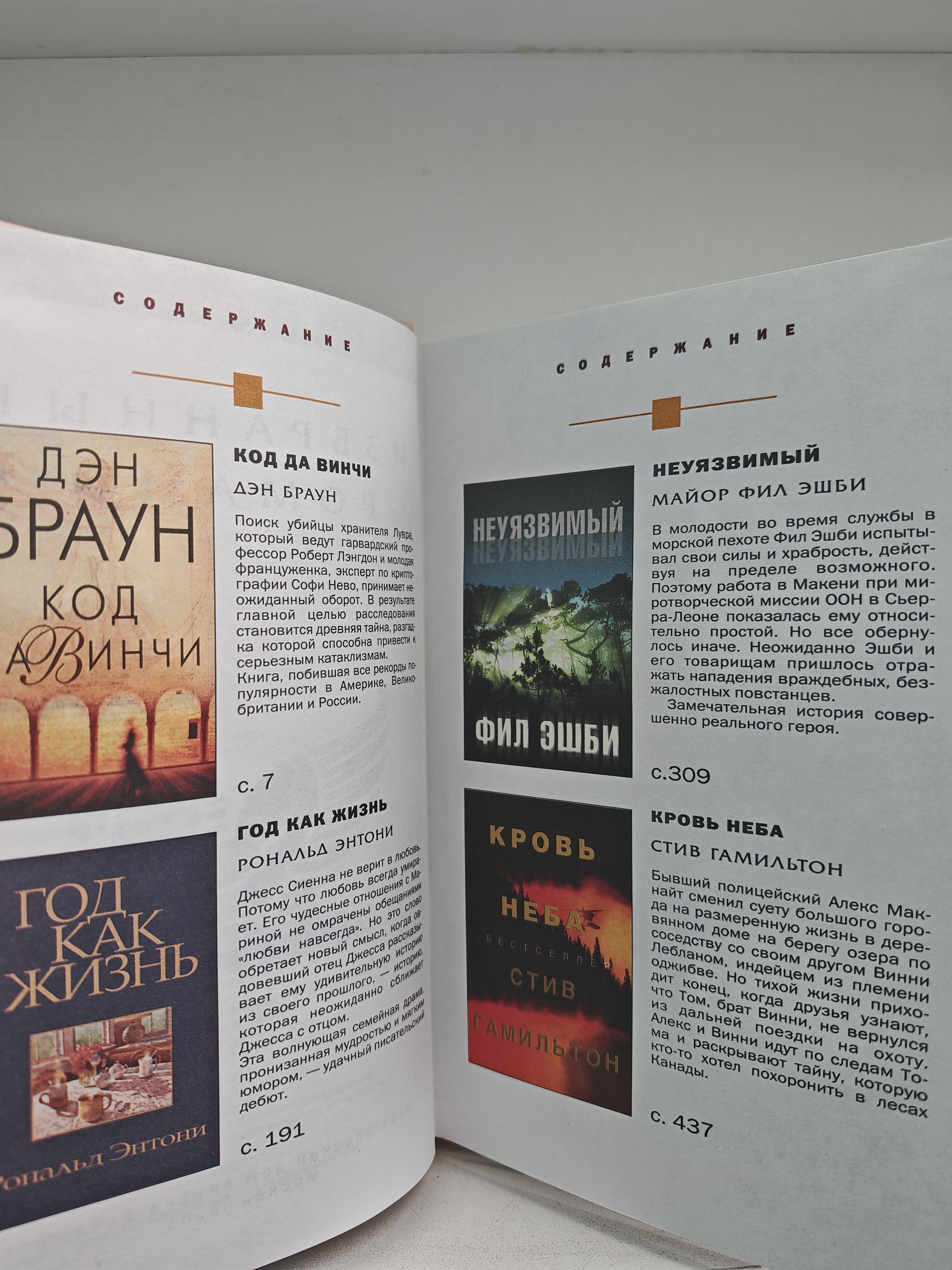 Дэн Браун. "Код да Винчи". Поиск убийцы хранителя Лувра, который ведут гарвардский профессор Рот Лэнгдон и молодая француженка, эксперт по криптографии Софи Нево, принимает неожиданный оборот. В результате главной целью расследования становится древняя тайна, разгадка которой способна привести к серьезным катаклизмам. Книга, побившая все рекорды популярности в Америке, Великобритании и России. Рональд Энтони. "Год как жизнь". Джесс Сиенна не верит в любовь. Потому что любовь всегда умирает. Его чудесные отношения с Мариной не омрачены обещаниями "любви навсегда". Но это слово обретает новый смысл, когда овдовевший отец Джесса рассказывает ему удивительную историю из своего прошлого, - историю, которая неожиданно сближает Джесса с отцом. Эта волнующая семейная драма, пронизанная мудростью и мягким юмором, - удачный писательский дебют. Майор Фил Эшби. "Неуязвимый". В молодости во время службы в морской пехоте Фил Эшби испытывал свои силы и храбрость, действуя на пределе возможного.