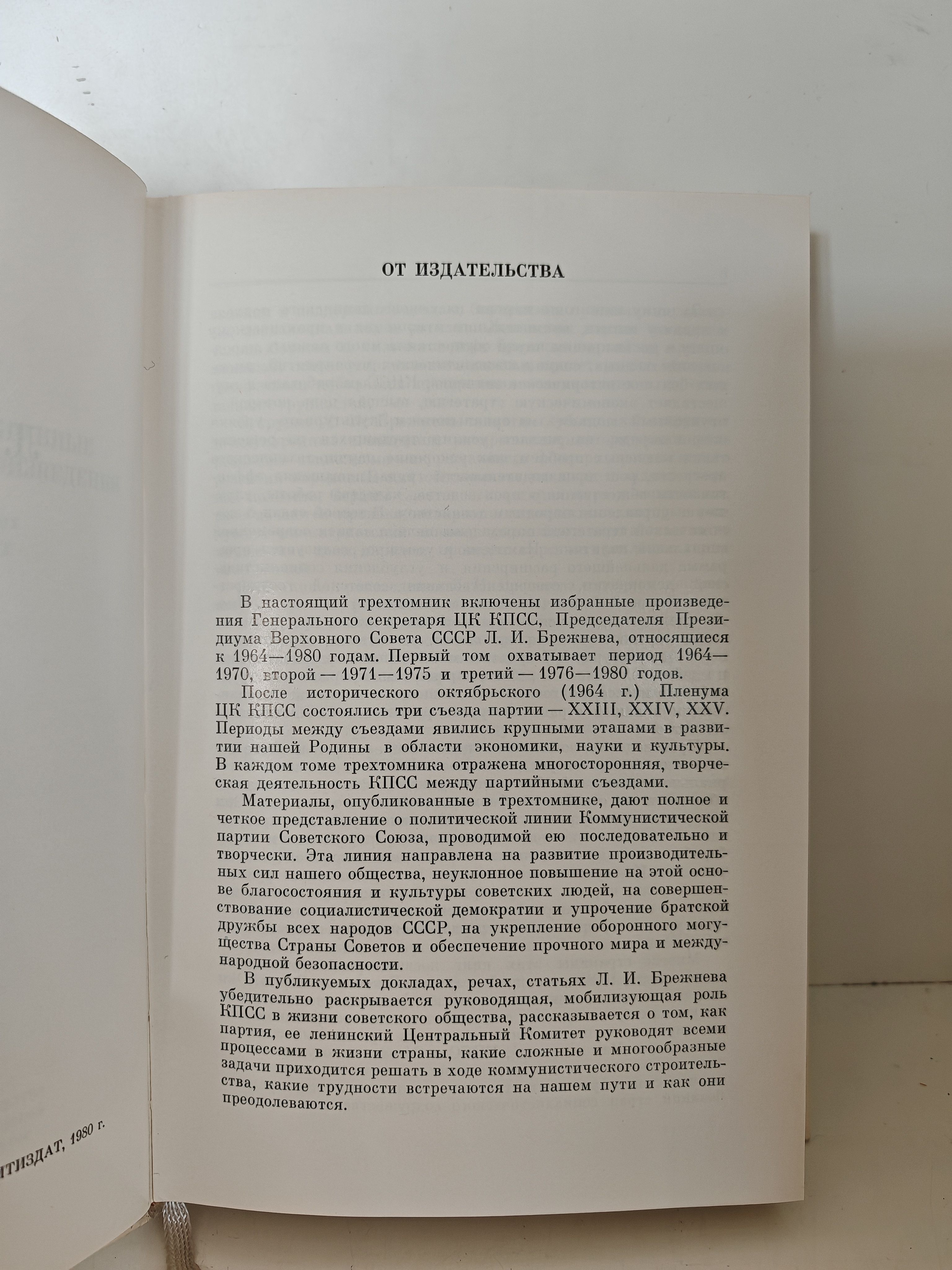 Трёхтомное издание избранных политических трудов Л. И. Брежнева, охватывающее ключевые периоды его деятельности с 1964 по 1980 год. В сборник вошли речи, статьи, доклады и выступления Генерального секретаря ЦК КПСС, посвящённые: