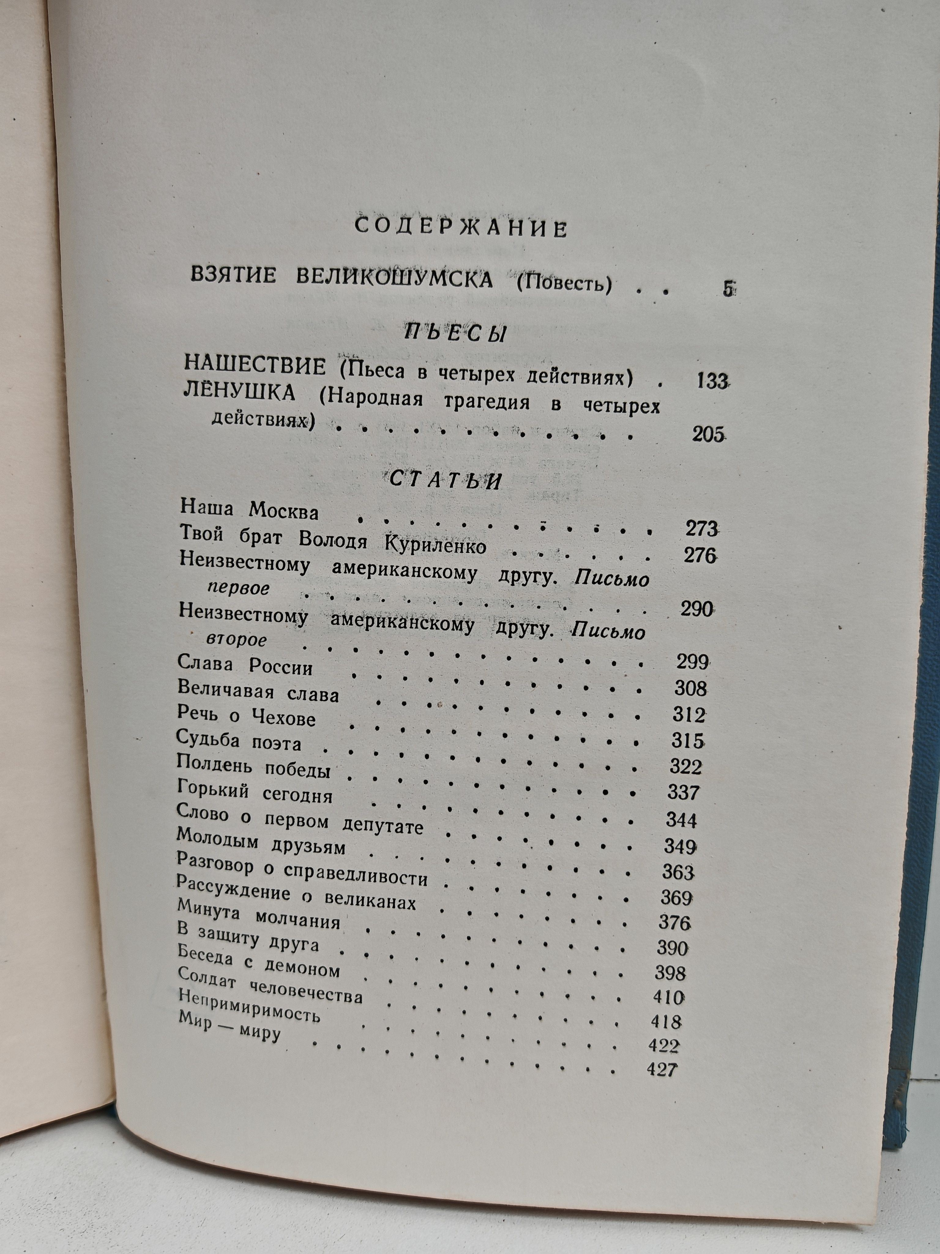 В пятый том собрания сочинений Леонида Леонова вошли повесть "Взятие Великошумска", пьесы "Нашествие", "Ленушка", а также статьи.