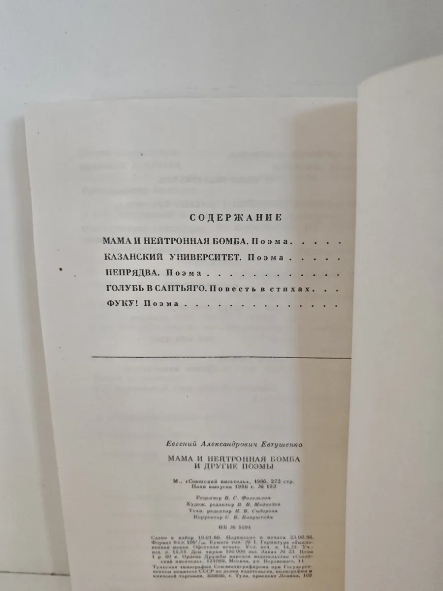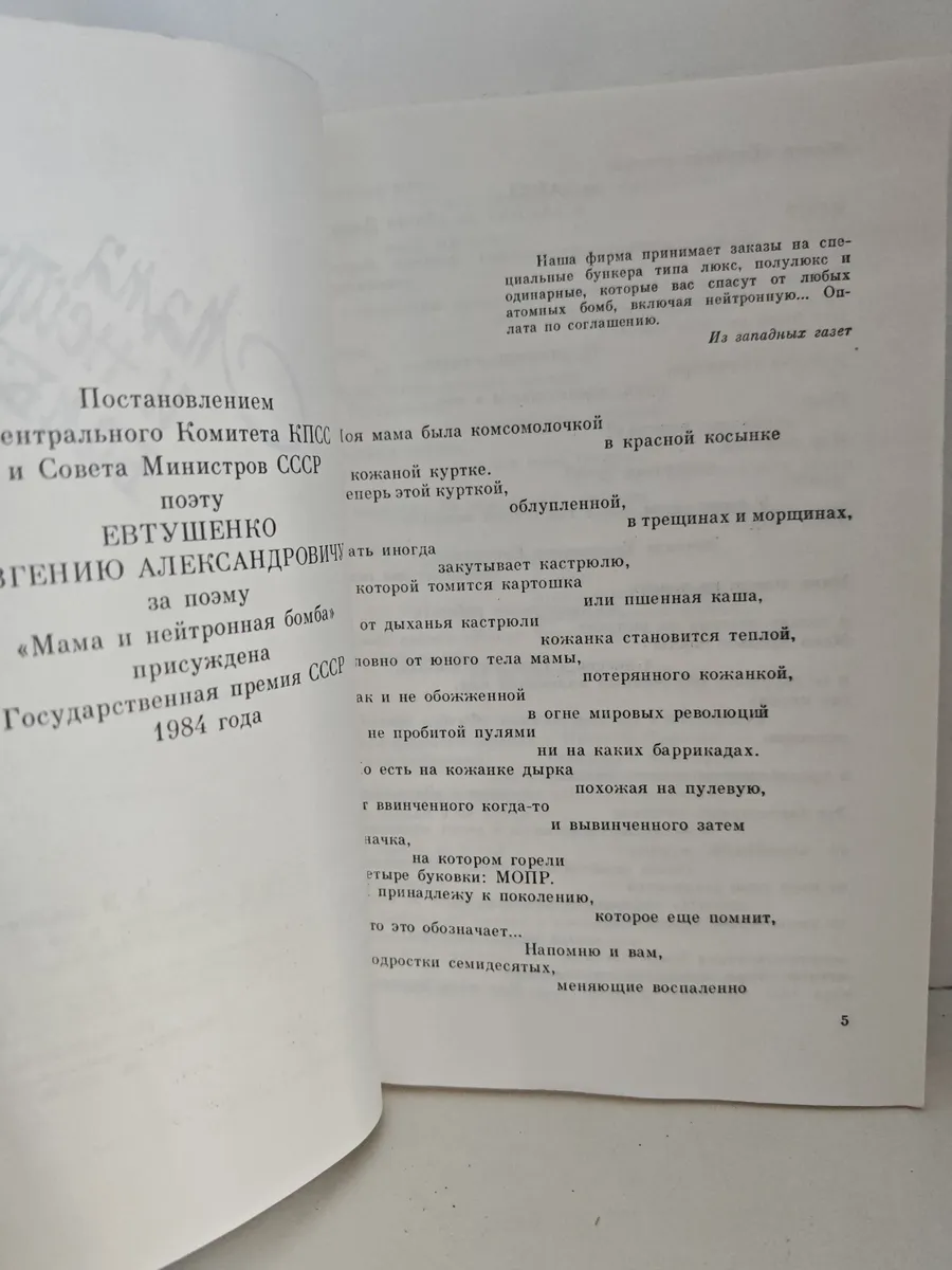 Сборник из пяти поэм Евгения Евтушенко, завоевавших широкое читательское признание. Центральное место занимает поэма «Мама и нейтронная бомба», удостоенная Государственной премии СССР в 1984 году. В сборник также вошли поэмы: «Казанский университет», «Непрядва», «Голубь в Сантьяго» и «Фуку!». Произведения отражают характерные для Евтушенко темы нравственности, гражданственности и международной политики, сочетая личную лирику с острыми социальными проблемами.
