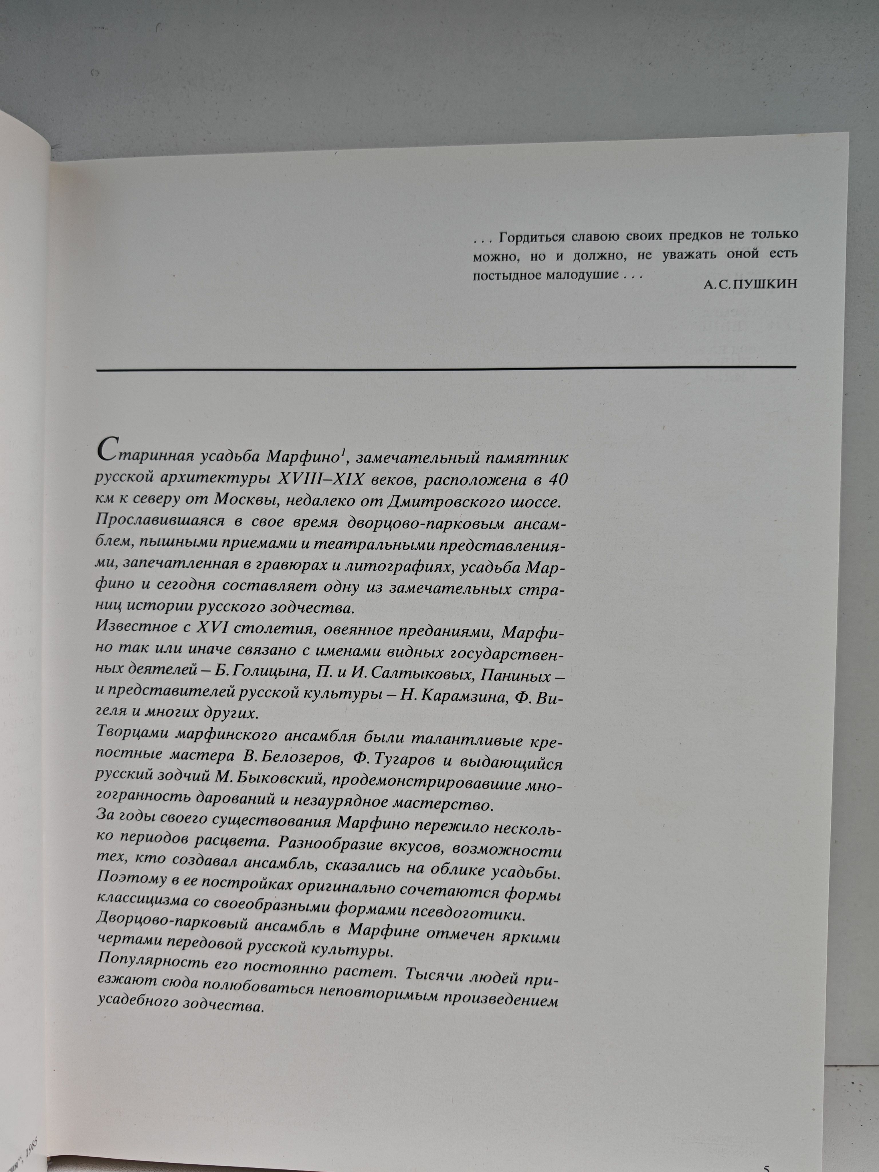 Настоящий богато иллюстрированный альбом посвящен старинной усадьбе Марфино. Великолепная усадьба Марфино, замечательный памятник русской архитектуры XVIII—XIX веков, расположена в 40 км к северу от Москвы, недалеко от Дмитровского шоссе. Прославившаяся в свое время дворцово-парковым ансамблем, пышными приемами и театральными представлениями, запечатленная в гравюрах и литографиях, усадьба Марфино и сегодня составляет одну из замечательных страниц истории русского зодчества.