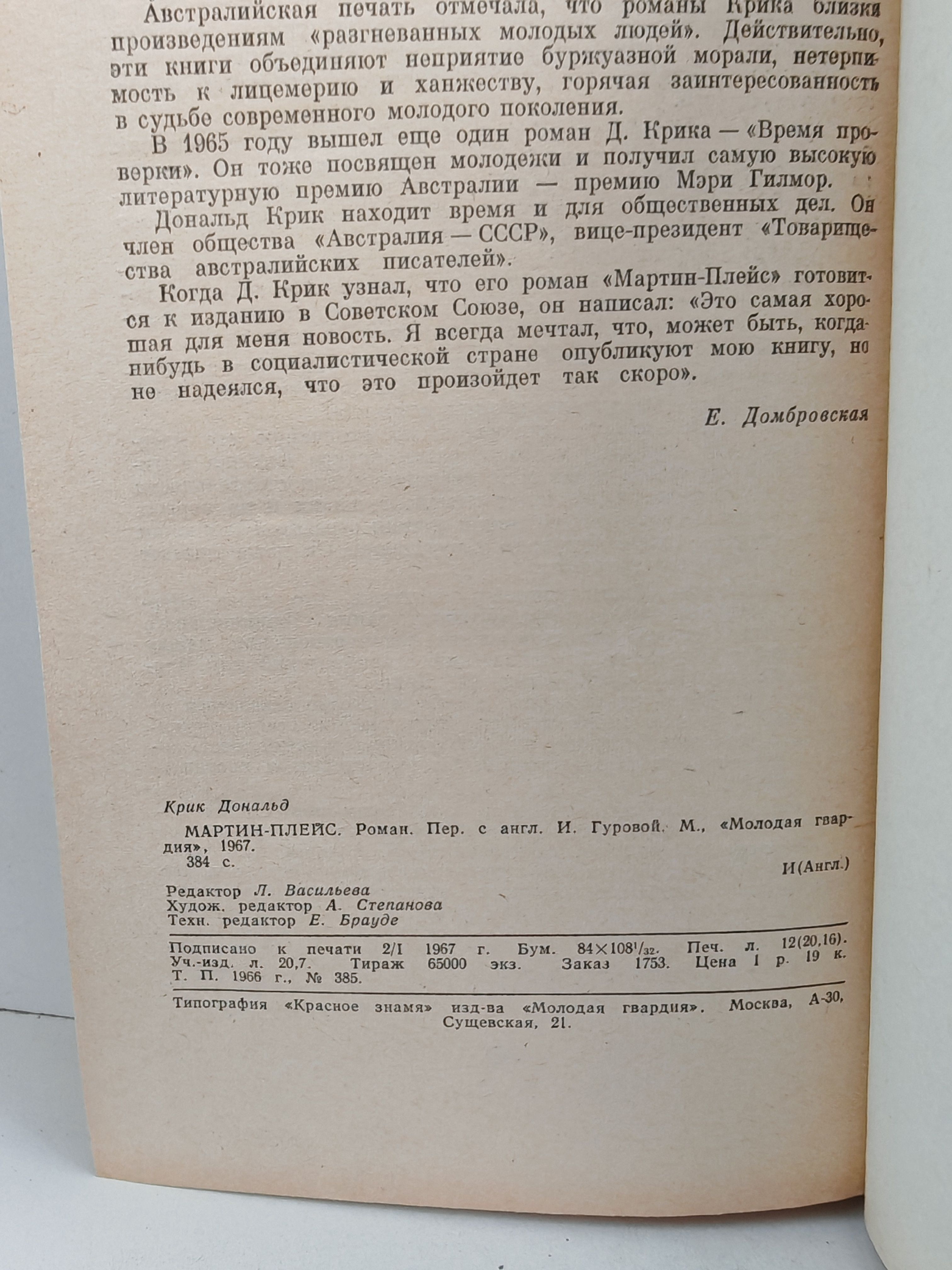 В романе «Мартин-Плейс» Д.Крик рассказал о городской Австралии, о судьбах тысяч австралийских юношей и девушек, которые подростками начинают служить в государственных учреждениях, в различных банковских, коммерческих конторах. Эта книга во многом автобиографична.