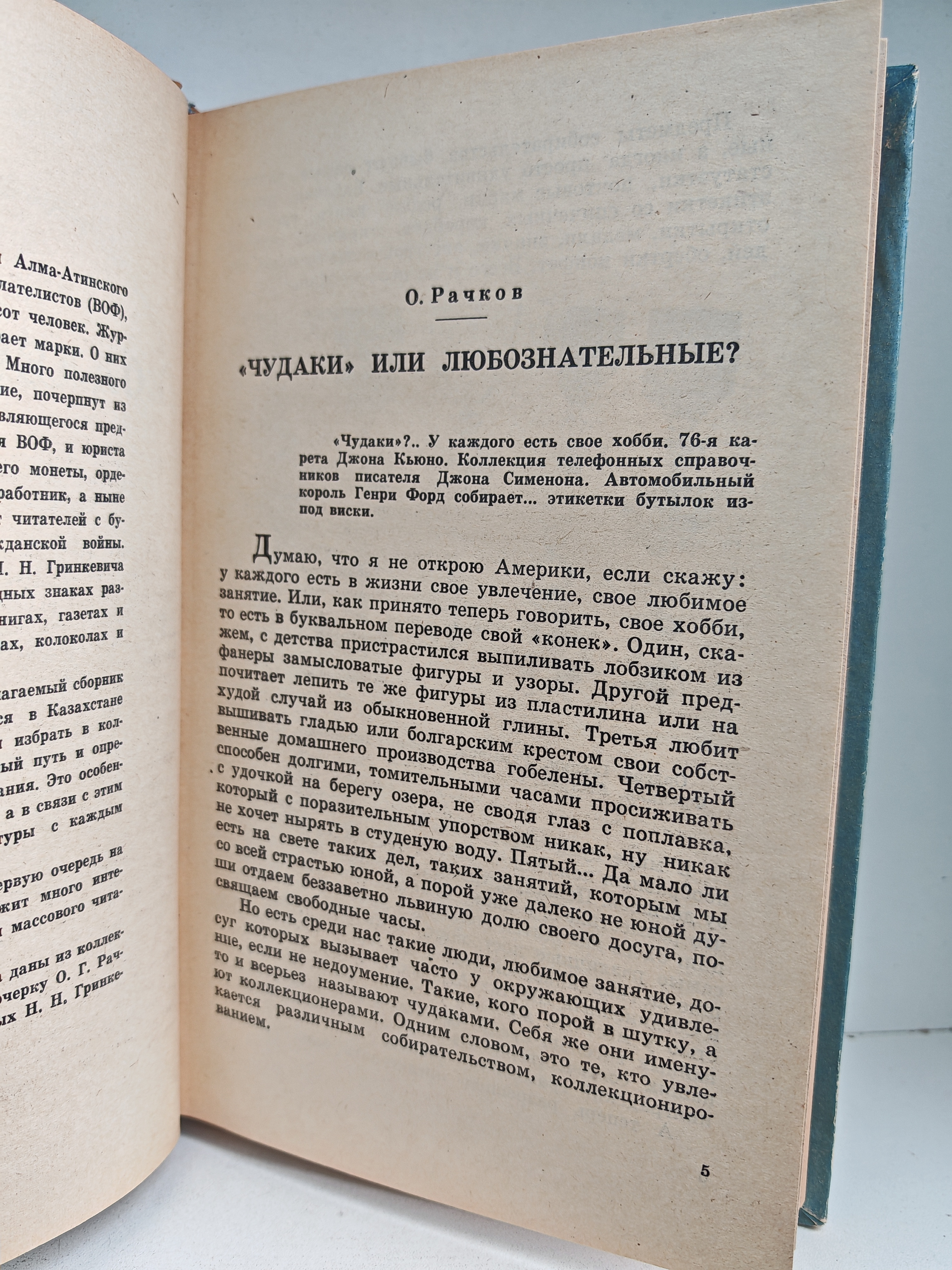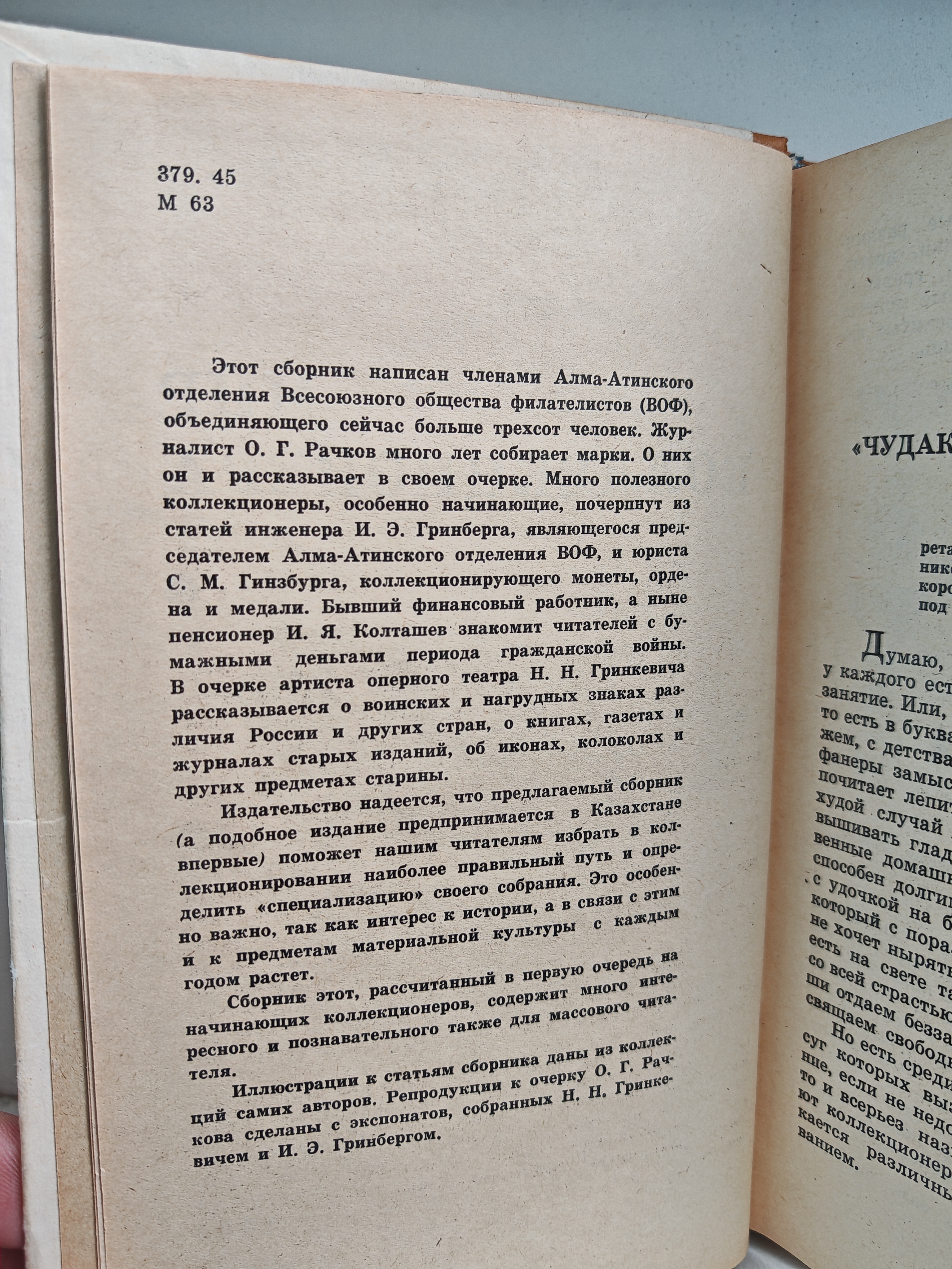 Сборник статей, написанный членами Алма-Атинского отделения Всесоюзного общества филателистов (ВОФ). Включает очерки о различных видах коллекционирования: — журналист О. Г. Рачков рассказывает о коллекционировании марок; — инженер И. Э. Гринберг (председатель Алма-Атинского отделения ВОФ) делится опытом; — юрист С. М. Гинзбург пишет о коллекционировании монет, орденов и медалей; — пенсионер И. Я. Колташев знакомит с бумажными деньгами периода Гражданской войны; — артист оперного театра Н. Н. Гринкевич рассказывает о воинских и нагрудных знаках, старых книгах, журналах, иконах, колоколах. Цель сборника — помочь начинающим коллекционерам выбрать «специализацию» и правильно организовать своё собрание. Иллюстрации взяты из коллекций авторов.