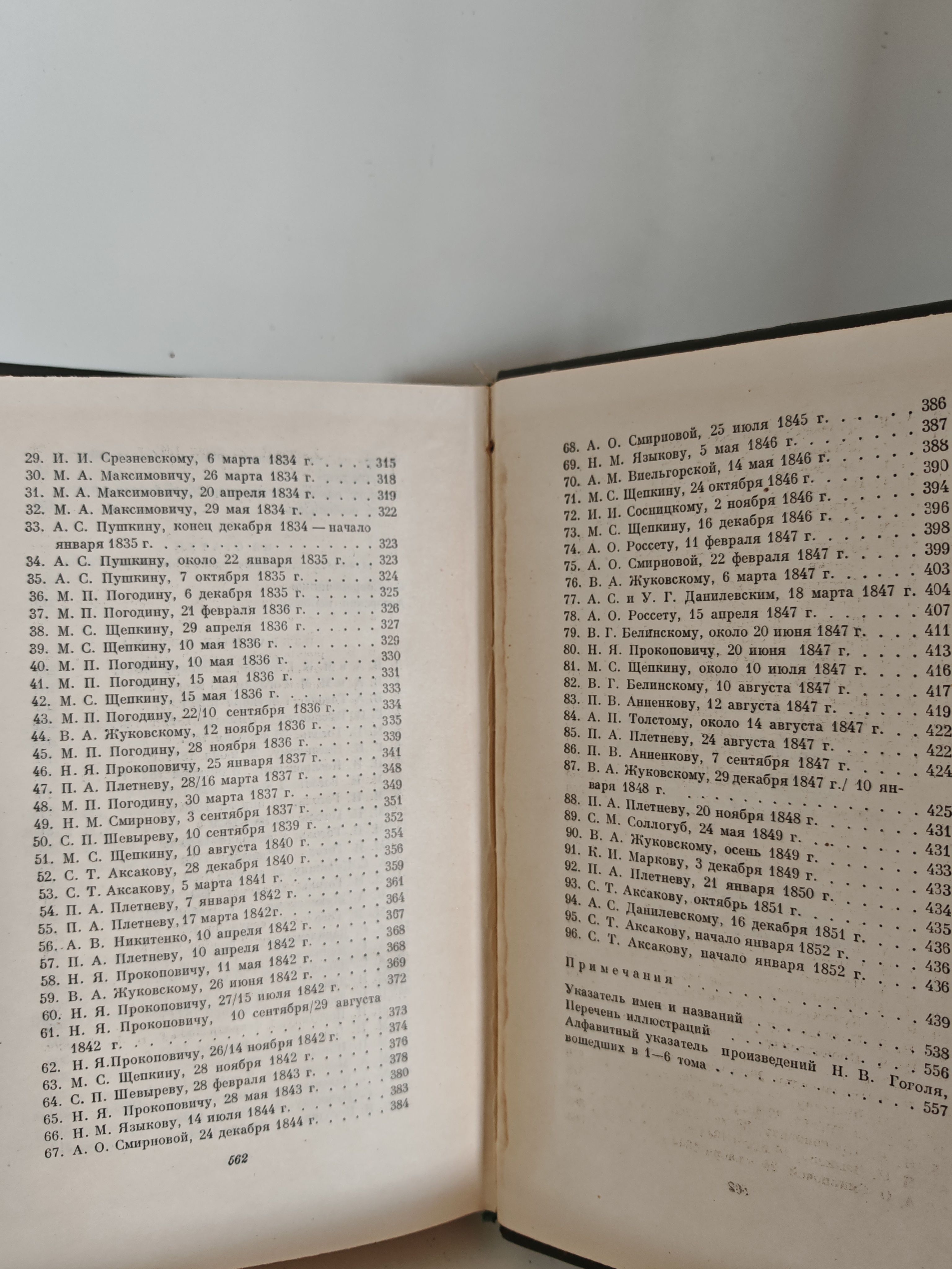 - письма к близким друзьям и коллегам (П. А. Плетнёву, В. А. Жуковскому, Н. М. Языкову и др.), в которых Гоголь делится творческими планами, переживаниями, размышлениями о судьбе России и роли писателя;