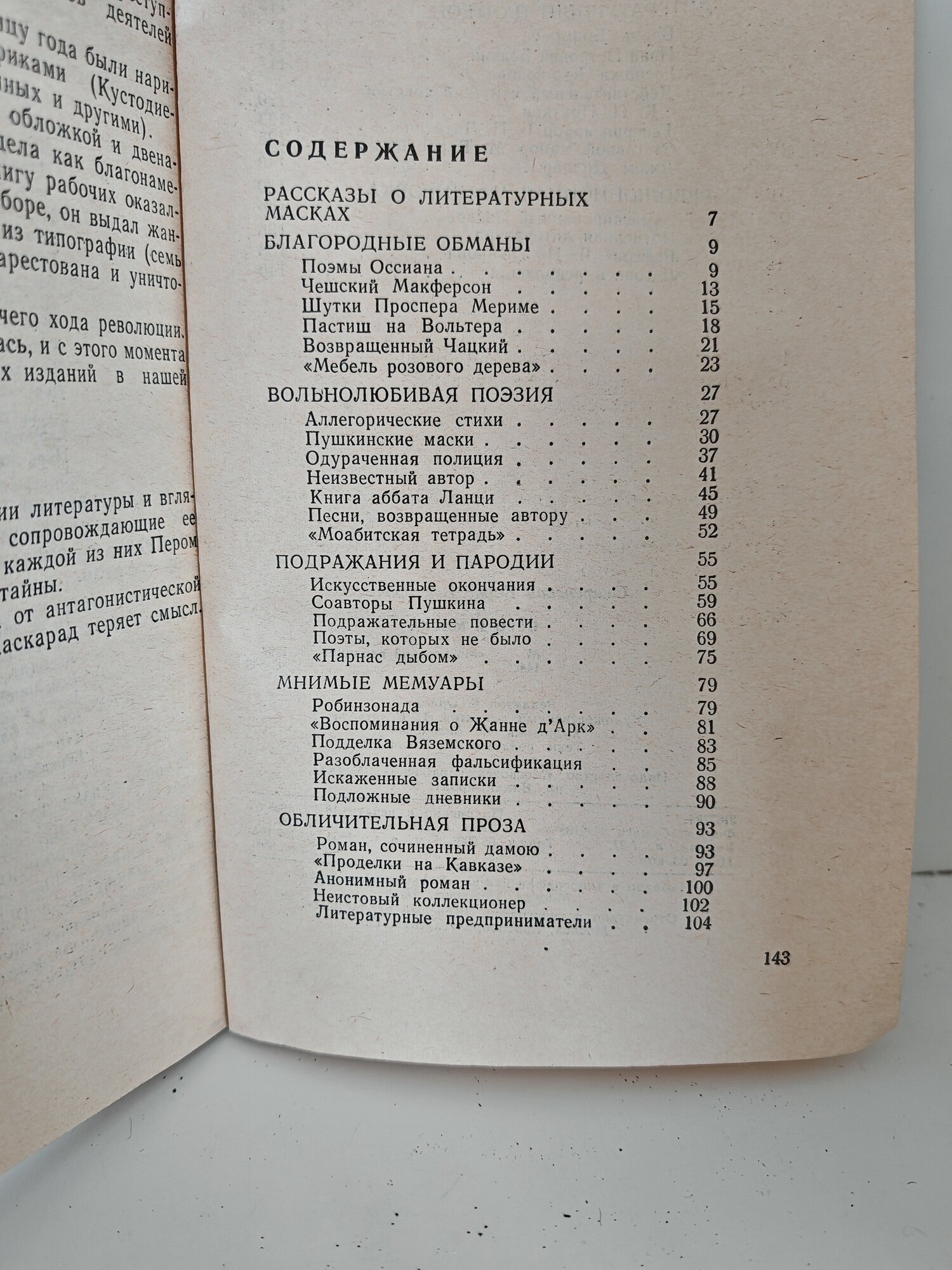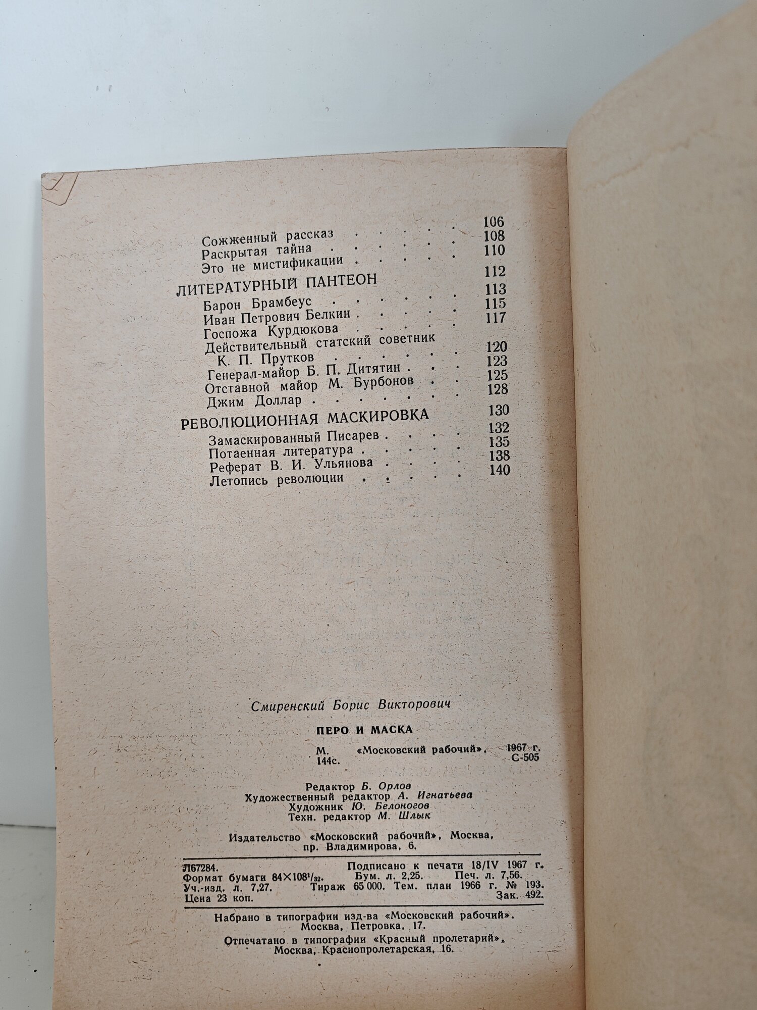 Представляет собою сборник новелл о литературных выдумках и мистификациях, объединенных здесь впервые под понятиями Пера и Маски. В большинстве они неизвестны широкому кругу читателей. В книге рассказывается и о том, как в дореволюционное время трудовая и общественная жизнь выступала против социального гнета и нравственных пороков, вынужденно прибегая к литературной маскировке.