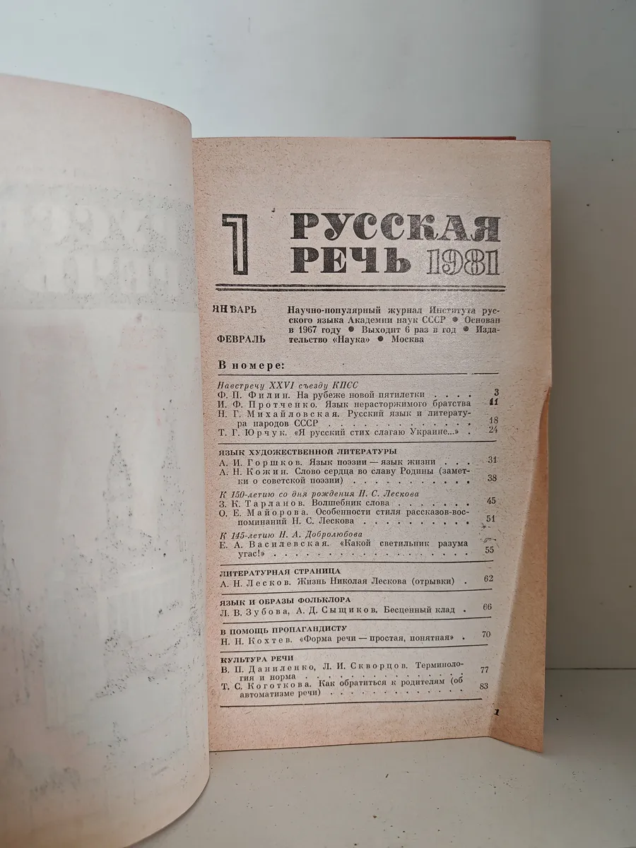 Научно-популярный журнал Института русского языка Академии наук СССР, посвящённый вопросам русского языка, литературы и культуры. В номере представлены статьи о языке художественной литературы, фольклоре, культуре речи, а также материалы, приуроченные к значимым датам (150-летие Н. С. Лескова, 145-летие Н. А. Добролюбова). Журнал адресован филологам, учителям, журналистам и всем любителям русского языка.