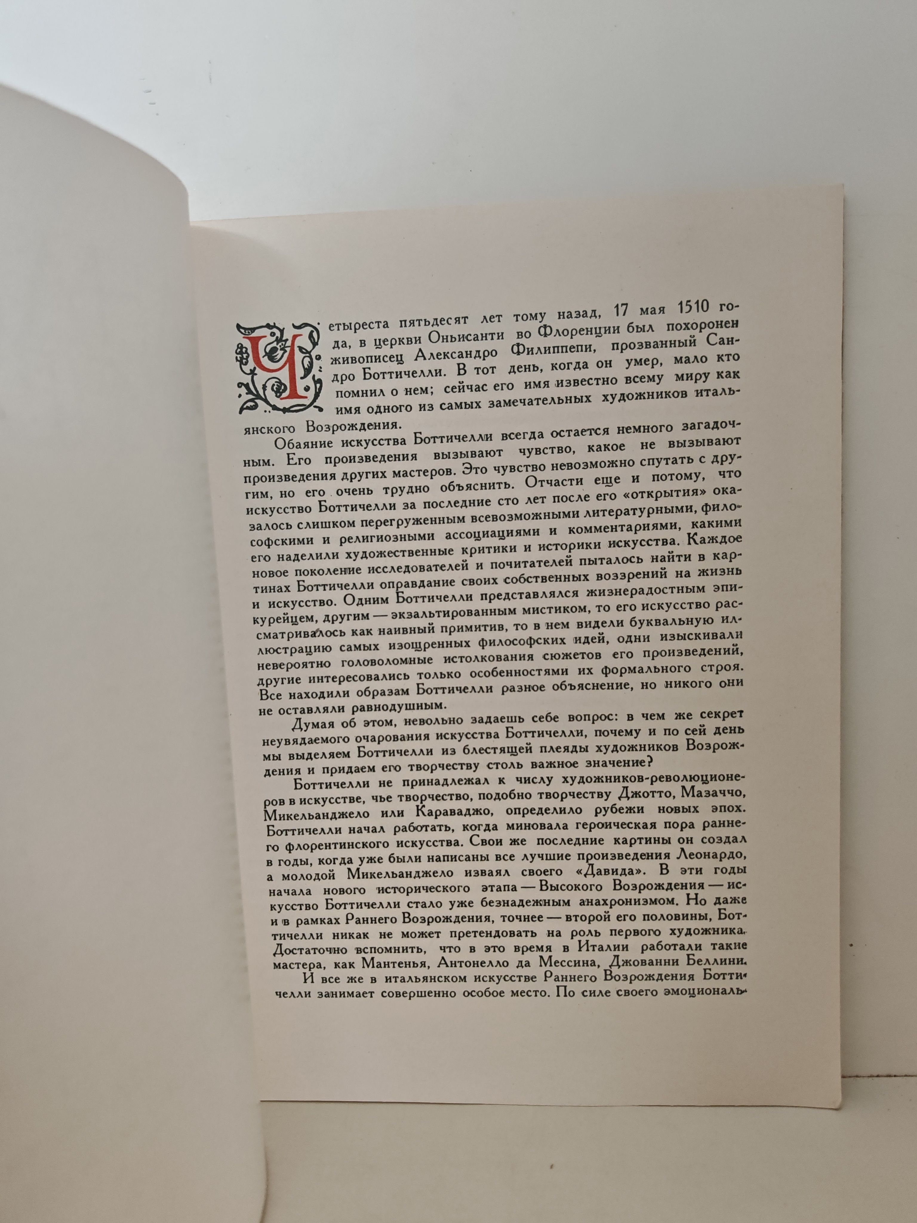 Книга была издана в эпоху, когда интерес к искусству Возрождения в СССР активно поддерживался — через популяризацию шедевров мировой культуры среди широкой аудитории. Издание подготовлено как часть просветительской миссии Государственного издательства изобразительного искусства, стремившегося познакомить читателей с великими мастерами прошлого. Составитель альбома, В. Гращенков, не только подобрал репродукции ключевых работ Боттичелли, но и написал вступительную статью, раскрывающую значение художника для мировой культуры. Публикация приурочена к продолжению традиции изучения и сохранения художественного наследия.