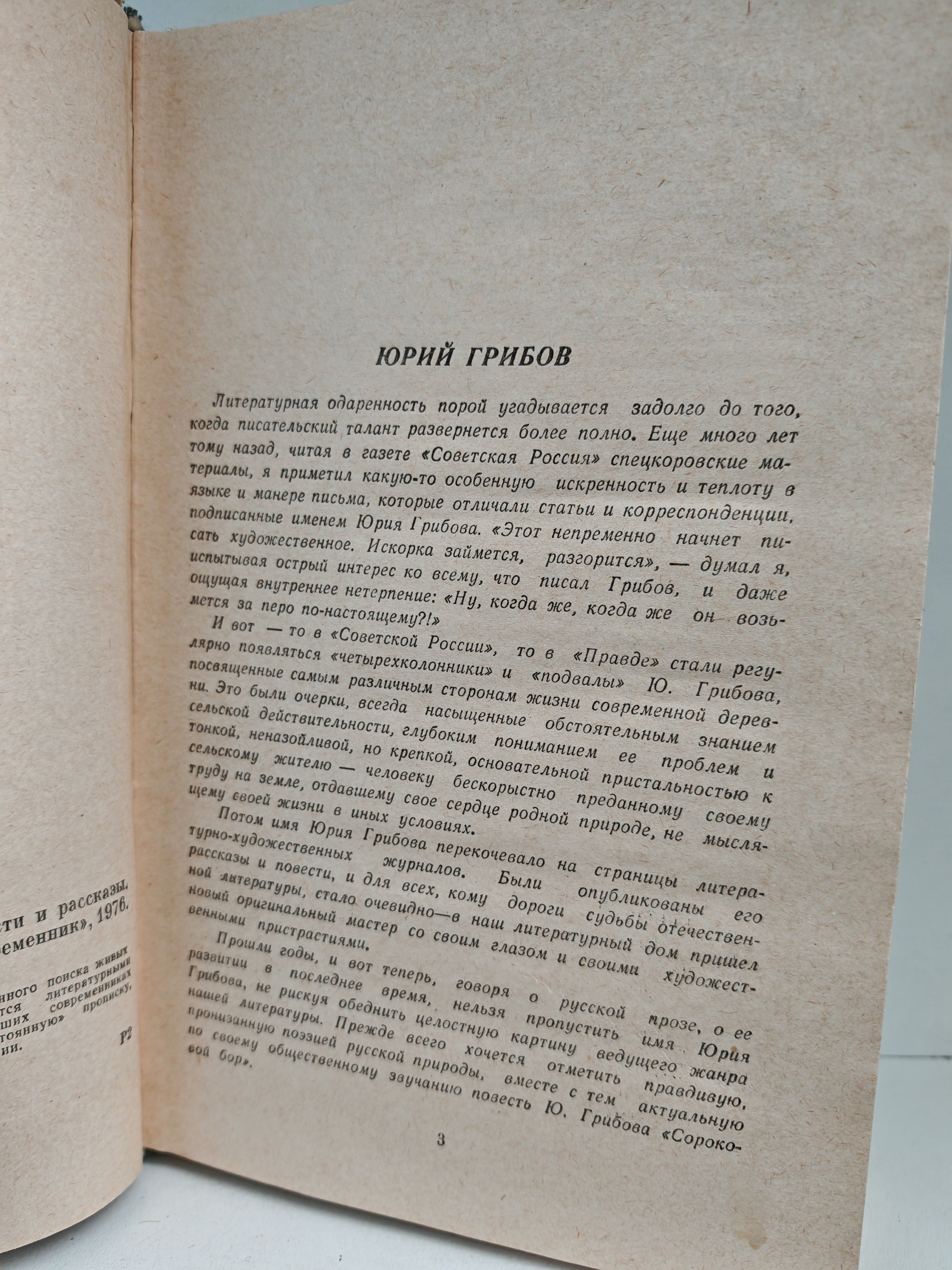 Юрий Грибов обладает редким даром неустанного поиска живых героев, которые в его произведениях становятся литературными персонажами. Известный писатель пишет о наших современниках тепло, правдиво. Герои его книг имеют "постоянную" прописку, точные адреса, свои собственные имена и фамилии.