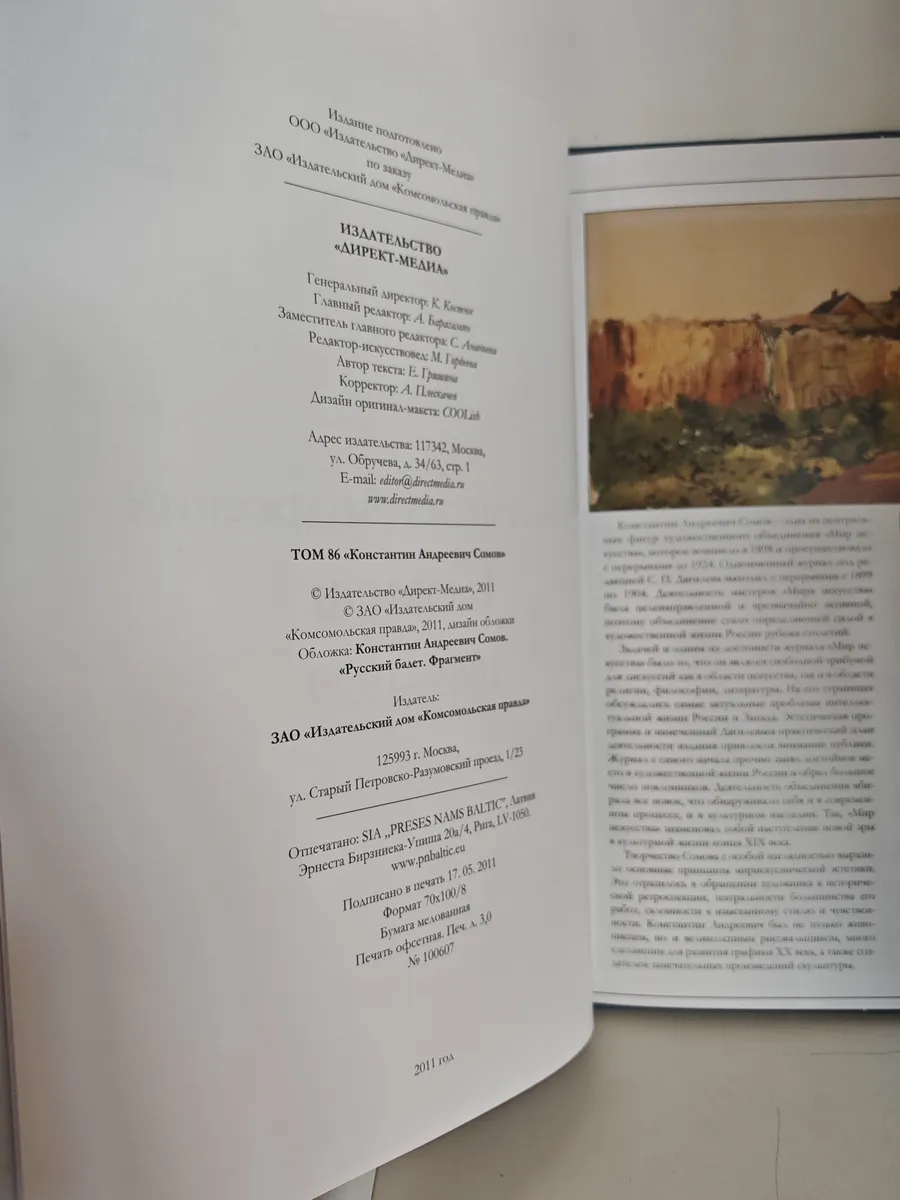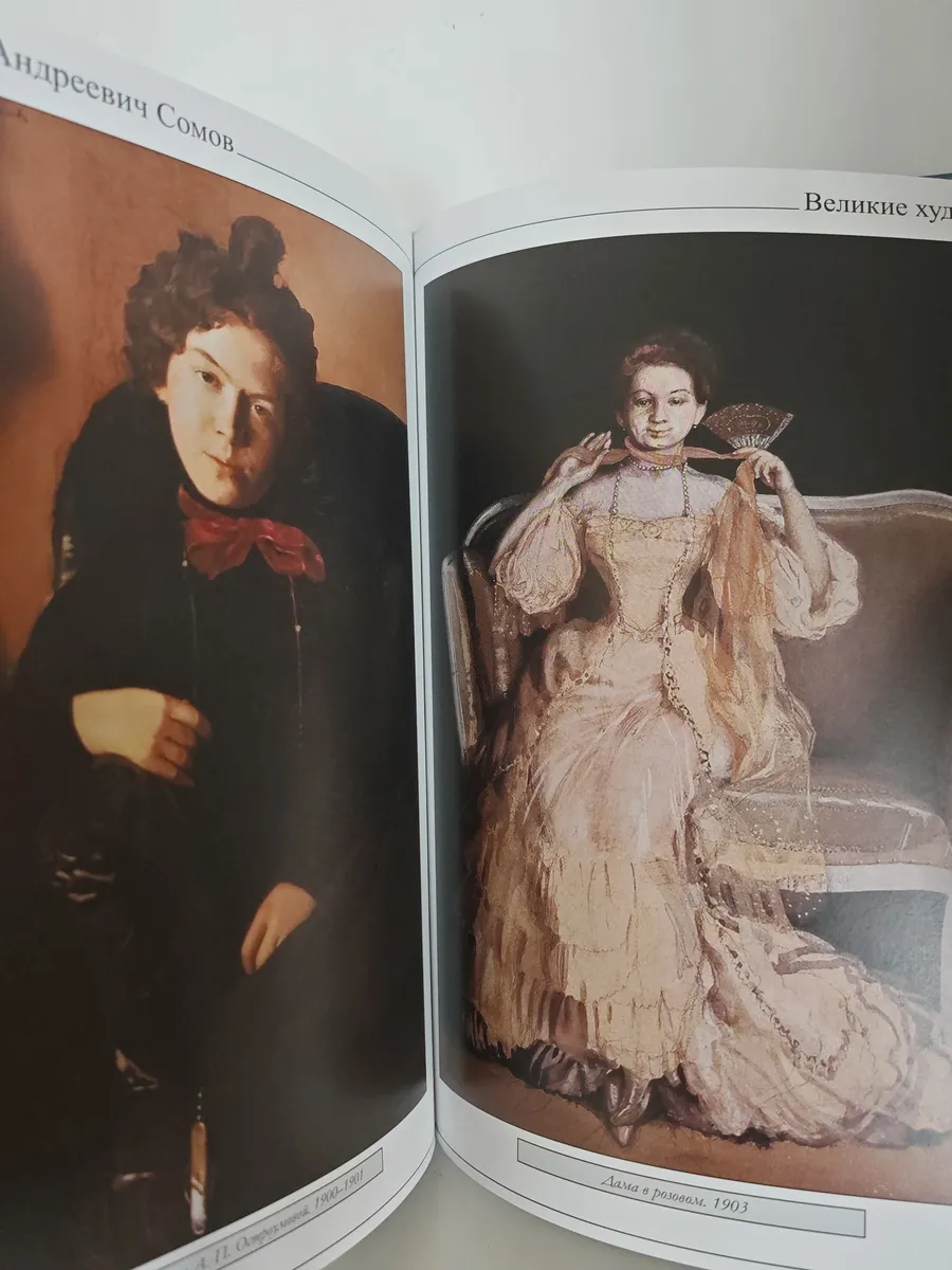 Альбом посвящён творчеству Константина Андреевича Сомова (1869–1939) — одного из основателей художественного объединения «Мир искусства». В книге представлены репродукции знаменитых работ художника: ретроспективные полотна с «галантными сценами», передающими дух XVIII века, изысканные портреты современников (включая портреты А. Блока, М. Кузмина), а также пейзажи. Текст раскрывает уникальный стиль Сомова: графическую точность, ироничность и меланхоличную эстетику «усадебной культуры».