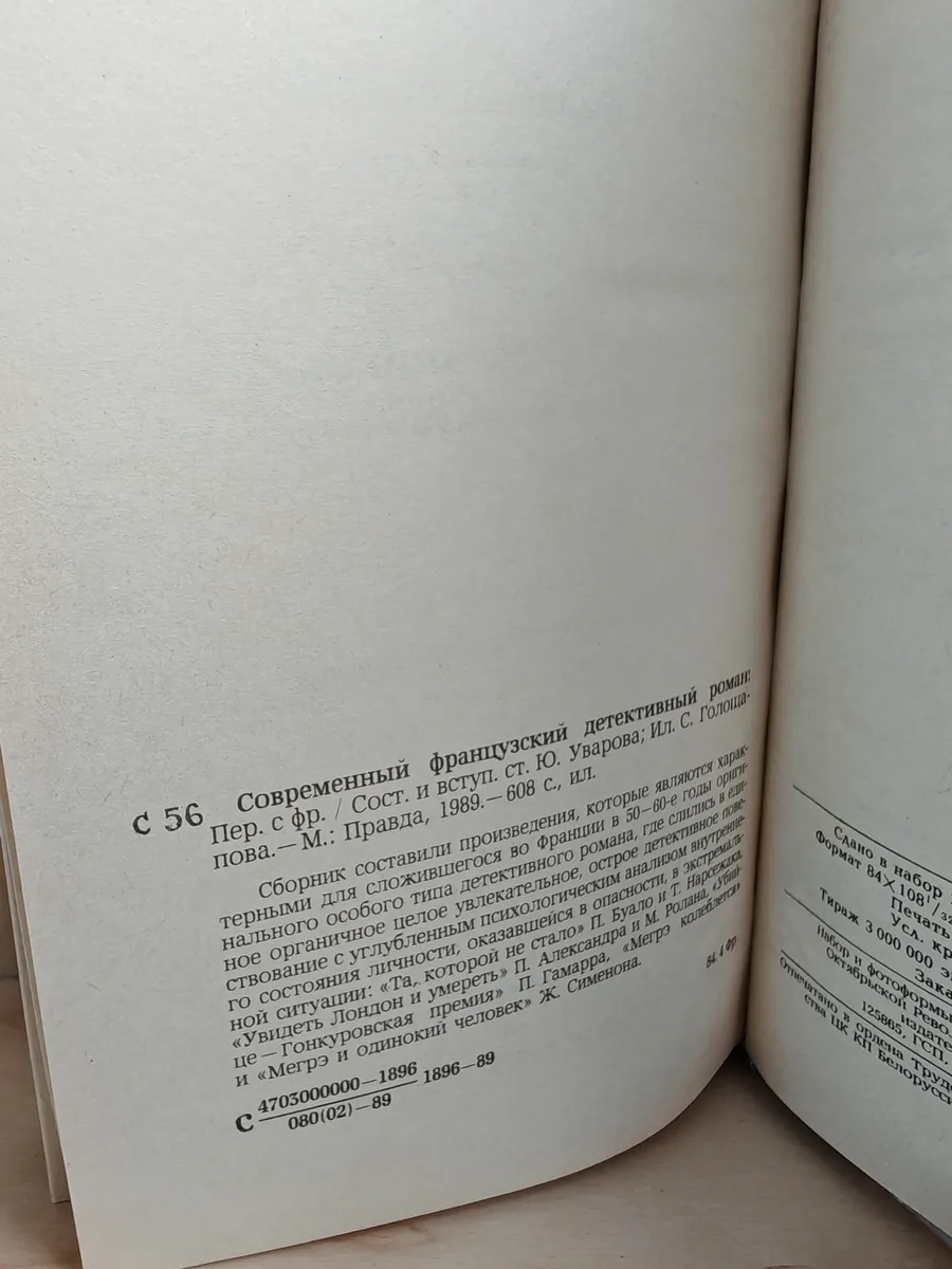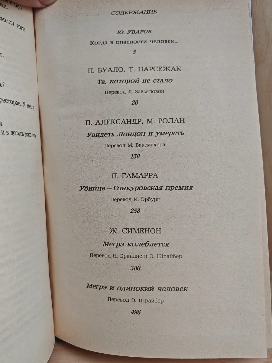 Сборник составили произведения, которые являются характерными для сложившегося во Франции в 50-60-е годы оригинального особого типа детективного романа, где слились в единое органичное целое увлекательное, острое детективное повествование с углубленным психологическим анализом внутреннего состояния личности, оказавшейся в опасности, в экстремальной ситуации: "Та, которой не стало" П.Буало, и Т.Нарсежака, "Увидеть Лондон и умереть" П.Александра и М.Ролана, "Убийце - Гонкуровская премия" П.Гамарра, "Мегрэ колеблется" и "Мегрэ и одинокий человек" Ж.Сименона.