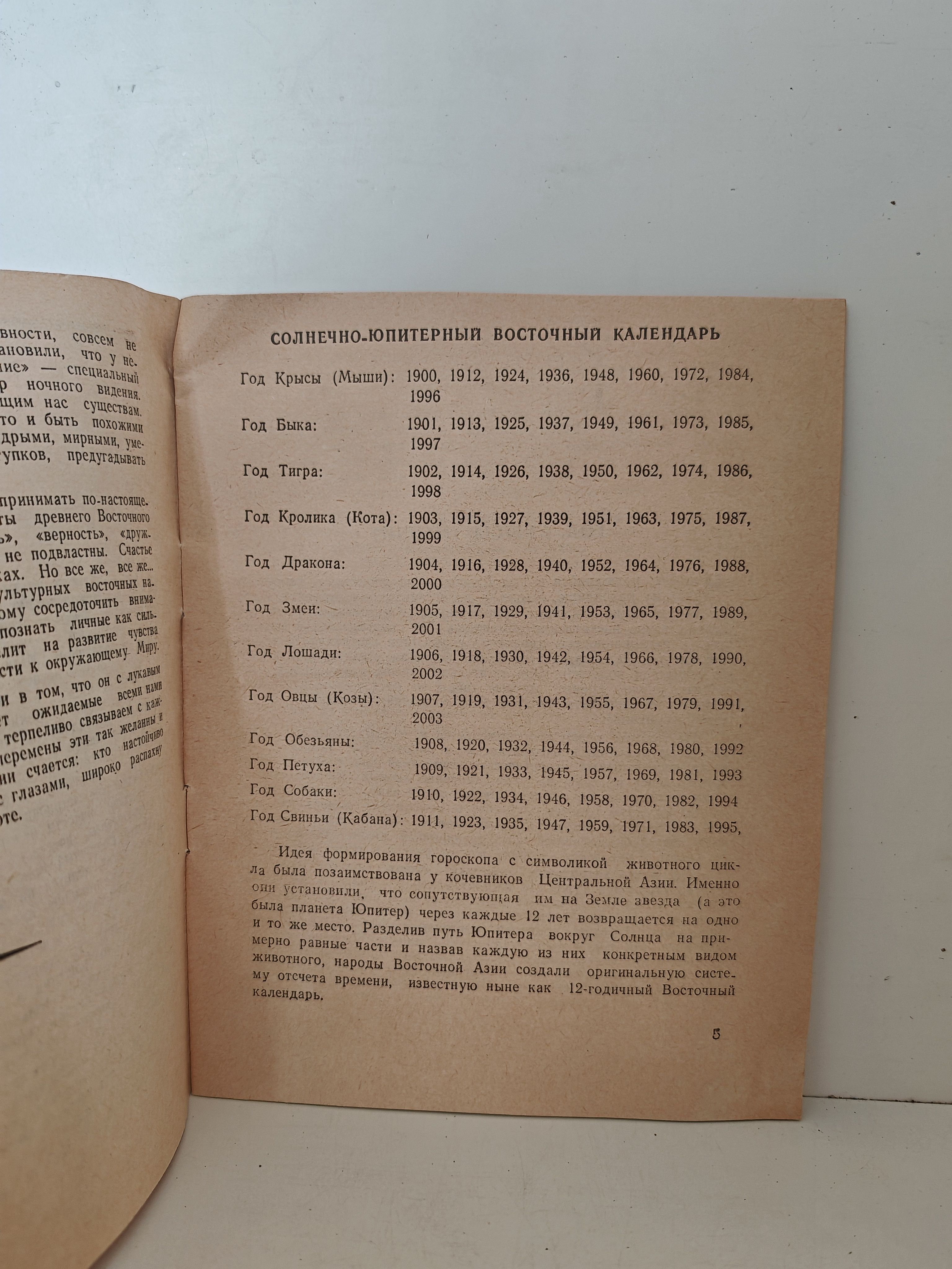 Сувенирное издание, посвящённое восточному (китайскому) гороскопу. Содержит краткие характеристики знаков зодиака по восточному календарю, иллюстрации, символизирующие животных-покровителей. Предназначено для широкого круга читателей — любителей астрологии и восточной культуры. Может использоваться как подарочный или декоративный предмет, а также как краткий справочник по восточному календарю.