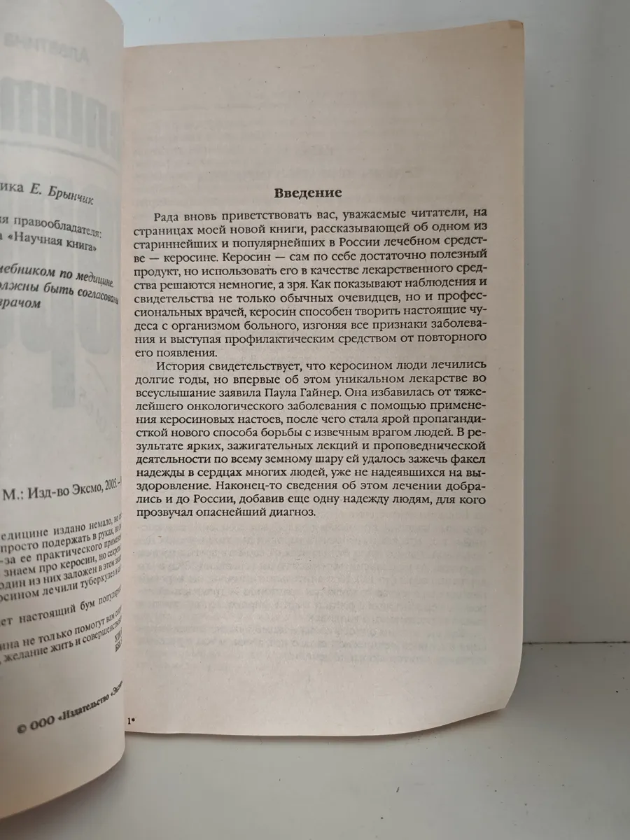 Книга посвящена использованию керосина в нетрадиционной медицине. Автор рассказывает о практическом применении керосина для лечения различных заболеваний (включая туберкулёз, ревматизм, чахотку и др.), его уникальных свойствах и профилактическом действии. В книге освещается история применения керосина, в том числе пример Паулы Гайнер, которая избавилась от онкологического заболевания с помощью керосиновых настоев. Подчёркивается, что все рекомендации должны применяться только после консультации с врачом.