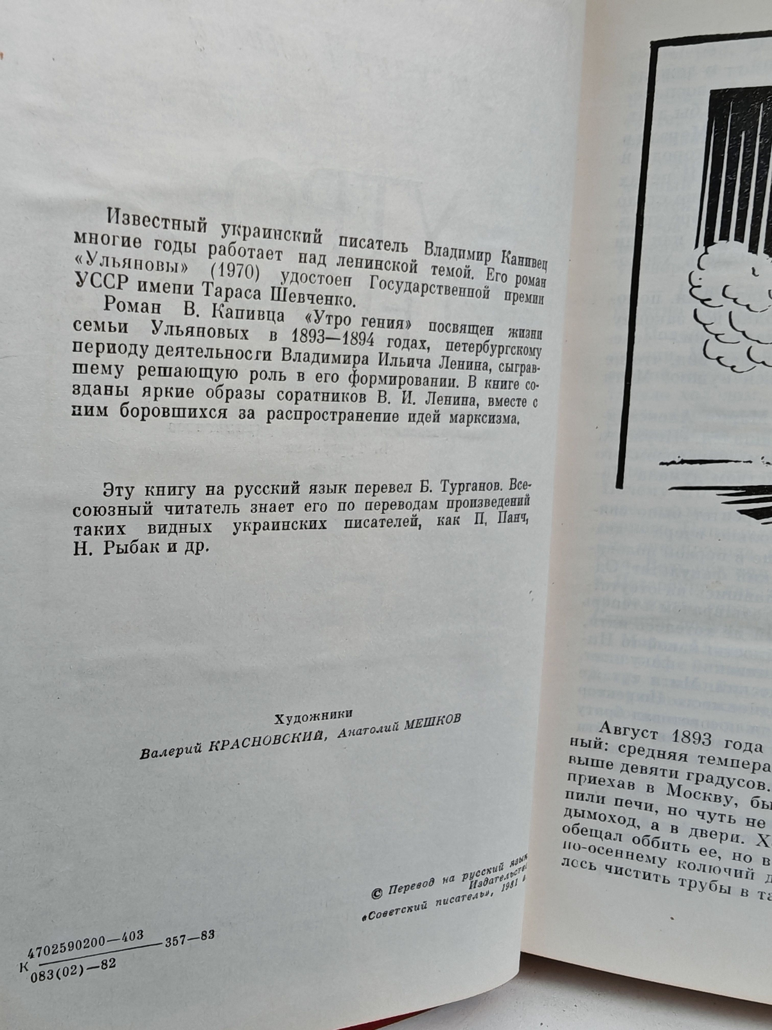 Роман В.Канивца «Утро гения» посвящен жизни семьи Ульяновых в 1893—1894 годах, петербургскому периоду деятельности Владимира Ильича Ленина, сыгравшему решающую роль в его формировании. В книге созданы яркие образы соратников В.И.Ленина, вместе с ним борющихся за идеи марксизма.