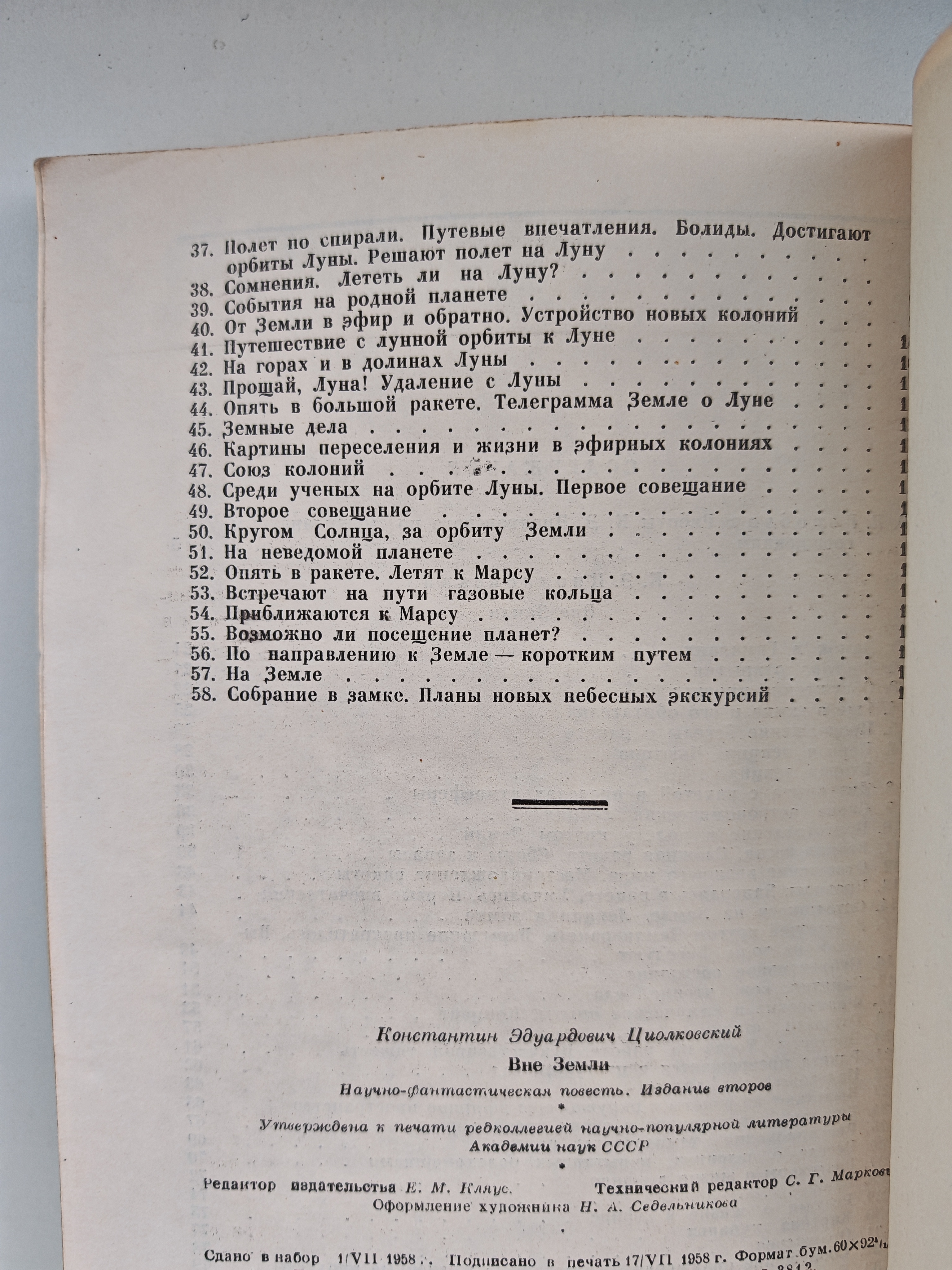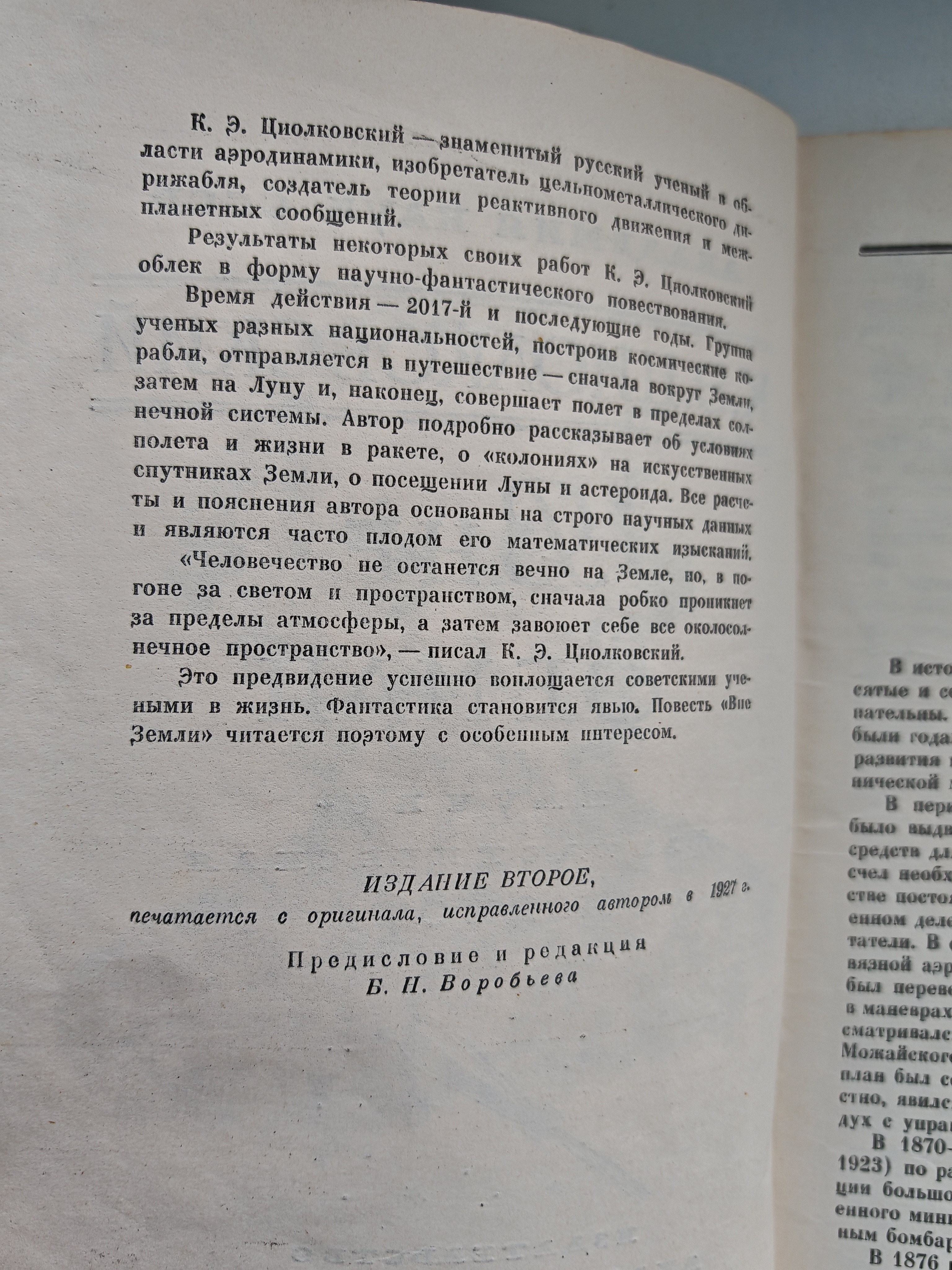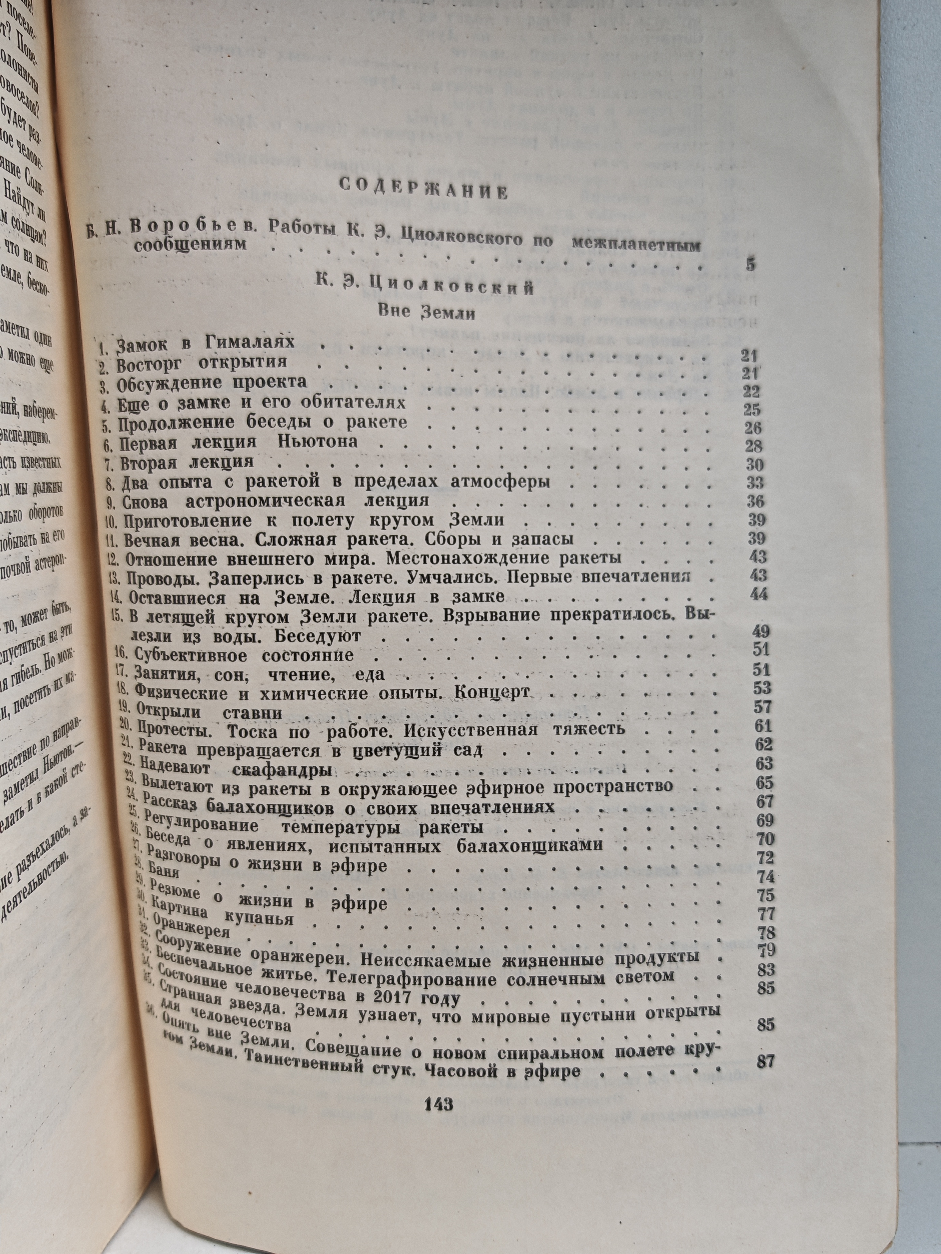 Научно-фантастическая повесть, в которой группа учёных разных национальностей (итальянец Галилей, француз Лаплас, англичанин Ньютон, американец Франклин, немец Гельмгольц и русский Иванов) строит космические корабли и отправляется в путешествие: сначала вокруг Земли, затем на Луну и, наконец, в пределы Солнечной системы. Автор подробно описывает условия полёта и жизни в ракете, «колонии» на искусственных спутниках Земли, посещение Луны и астероида. Все расчёты и пояснения основаны на строго научных данных и математических изысканиях К. Э. Циолковского. Время действия — 2017 год и последующие годы.