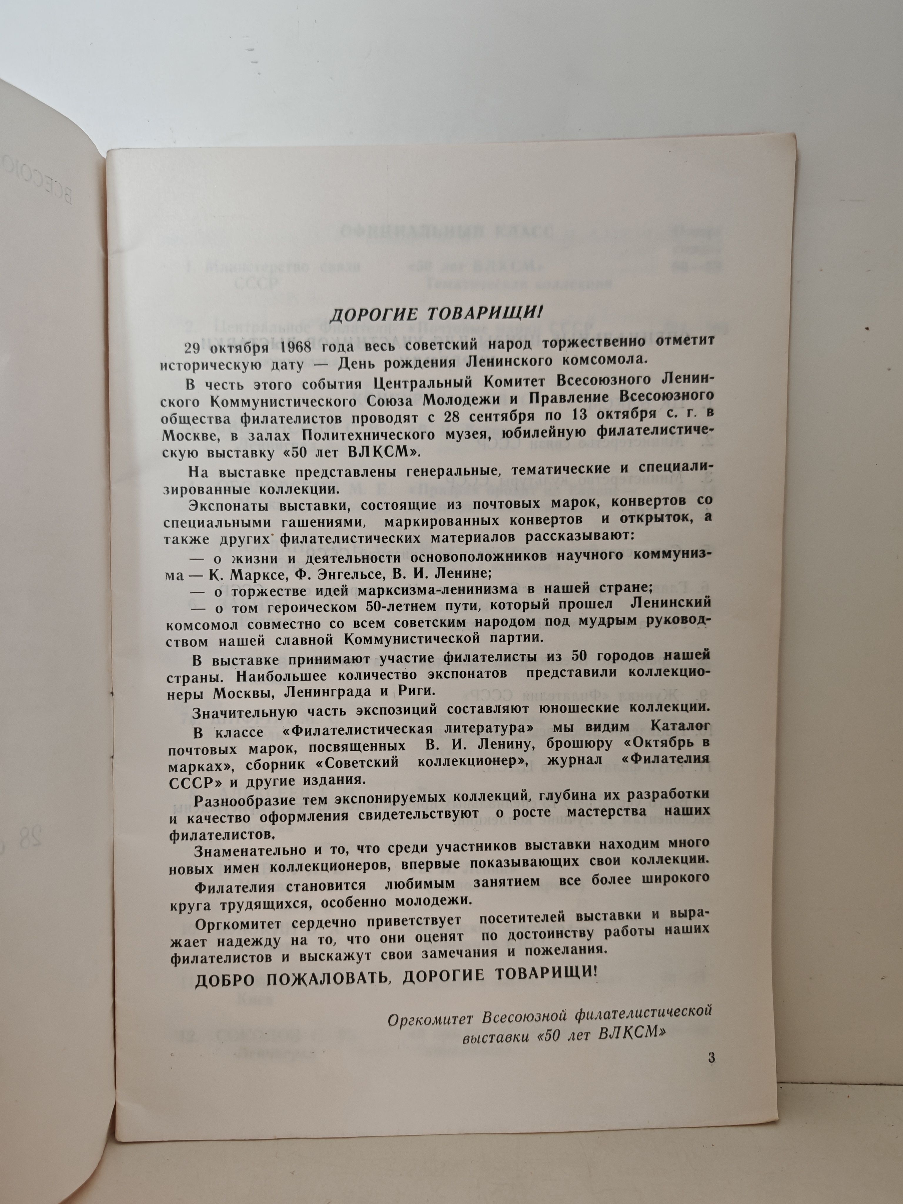 Каталог приурочен к Всесоюзной филателистической выставке, посвящённой 50-летию Всесоюзного Ленинского Коммунистического Союза Молодёжи (ВЛКСМ), которая проходила с 28 сентября по 13 октября 1968 года в Политехническом музее (Москва).