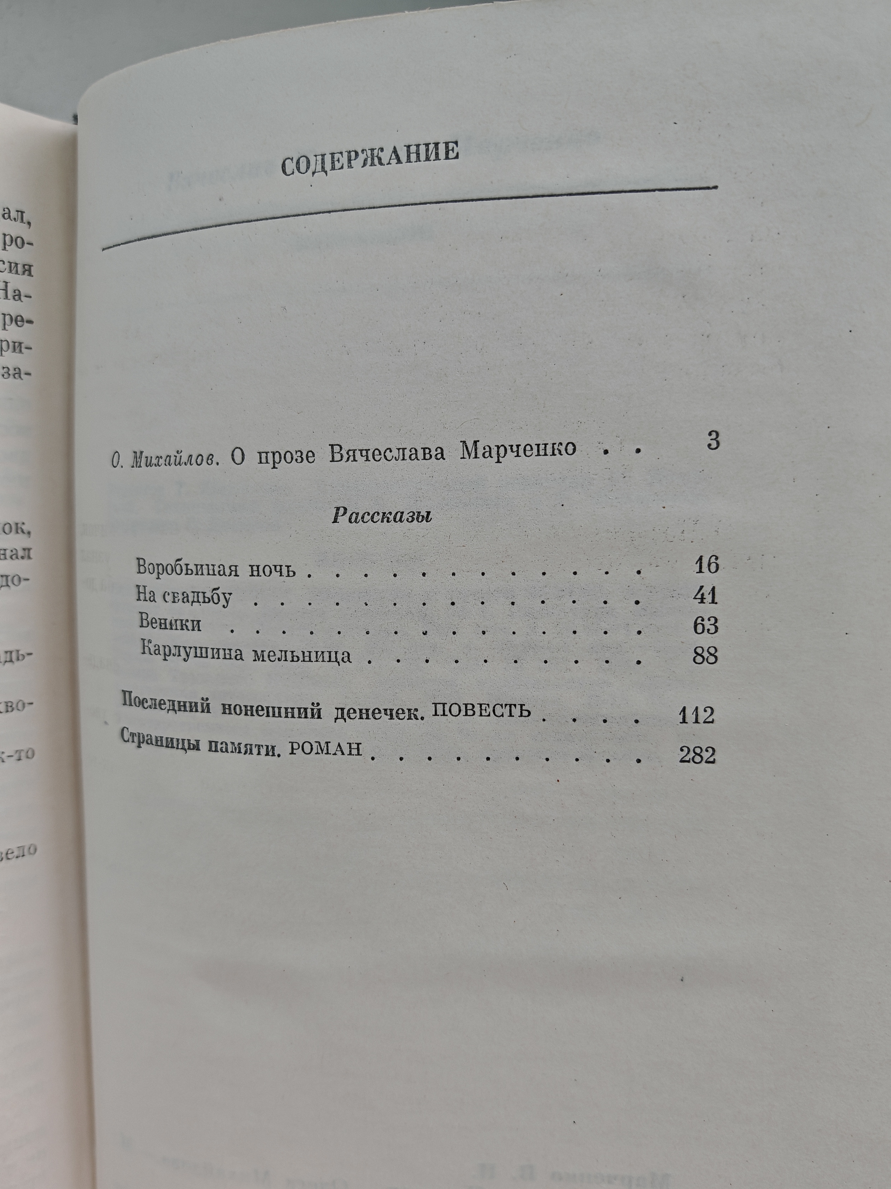 В сборник «Избранное» Вячеслава Марченко вошли лучшие произведения автора: — рассказы («Воробьиная ночь», «На свадьбу», «Веники», «Карлушина мельница»); — повесть «Последний нонешний денечек» (1974); — роман «Страницы памяти» (1976–1978). Книга представляет собой подборку ключевых работ писателя-мариниста, отражающих его фирменную тематику: жизнь моряков, дружбу, товарищество, непростые судьбы героев. Сочетает героико-патриотическую линию с глубокими морально-этическими размышлениями.