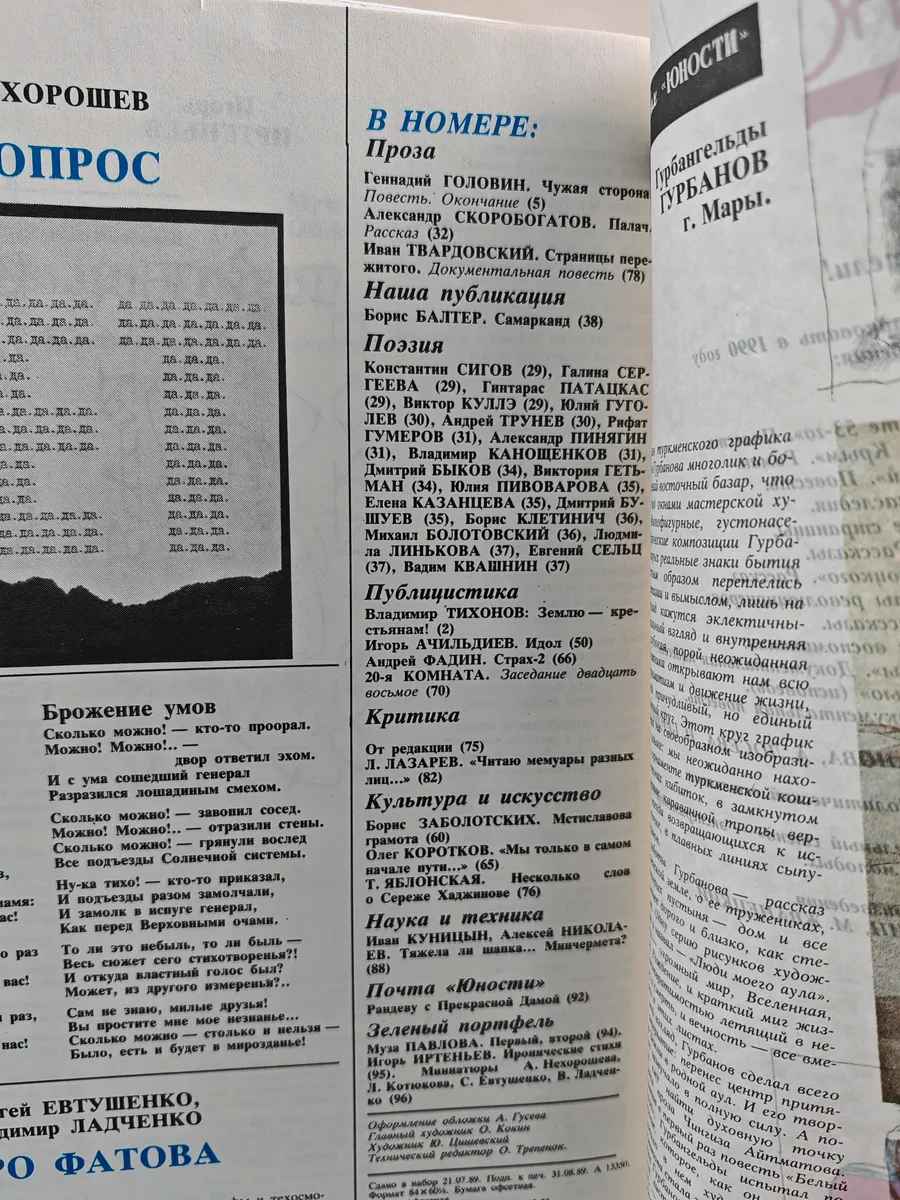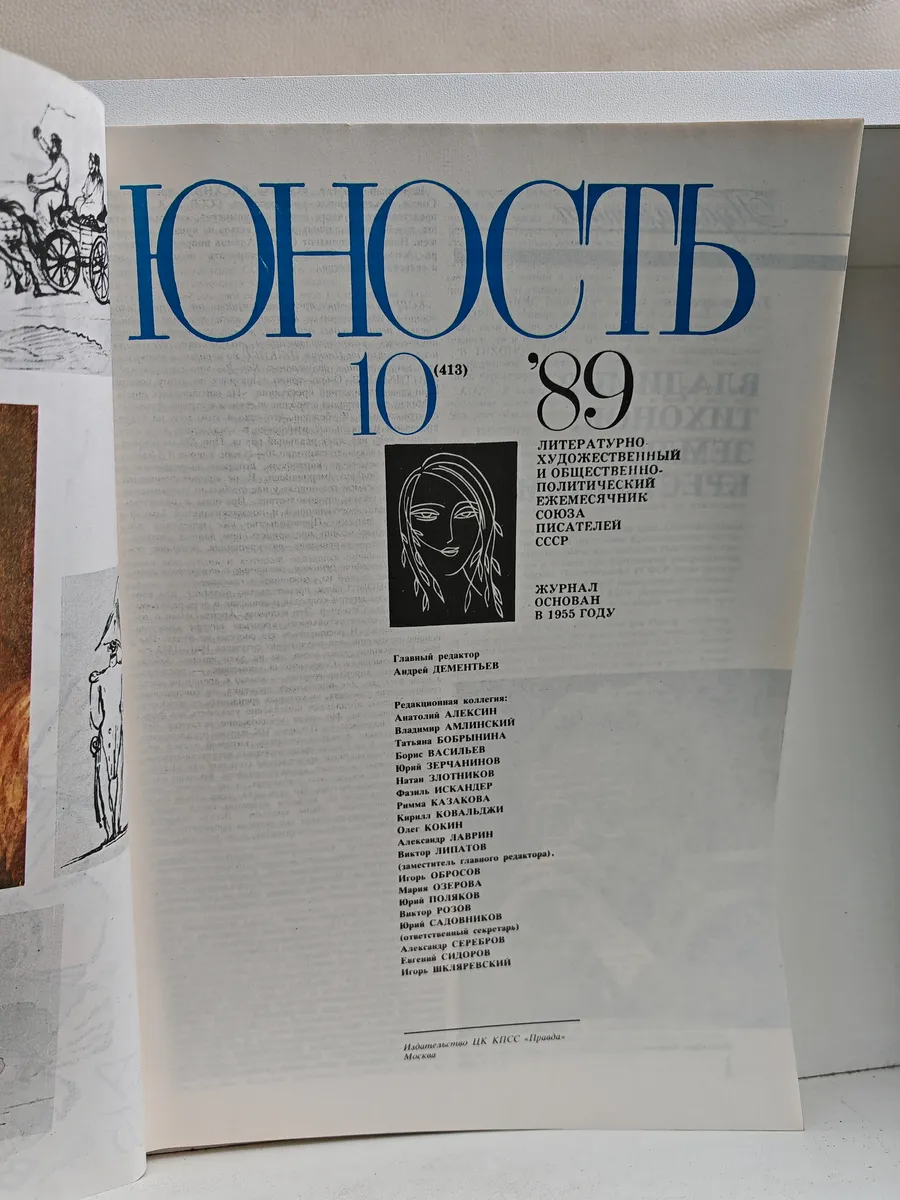 Литературно-художественный и общественно-политический ежемесячник Союза писателей СССР. Иллюстрированный журнал для молодёжи, публикующий прозу, поэзию, публицистику, а также материалы на общественно значимые темы. В номере № 10 (1989) представлены: повесть Г. Головина «Чужая сторона» (окончание), рассказ А. Скоробогатова «Палач», документальная повесть И. Твардовского «Страницы пережитого», поэтические произведения К. Сигова, Г. Сергеевой, Г. Патацкаса, В. Куллэ, Ю. Гуголева, А. Трунева, Р. Гумерова, А. Пинягина и др.