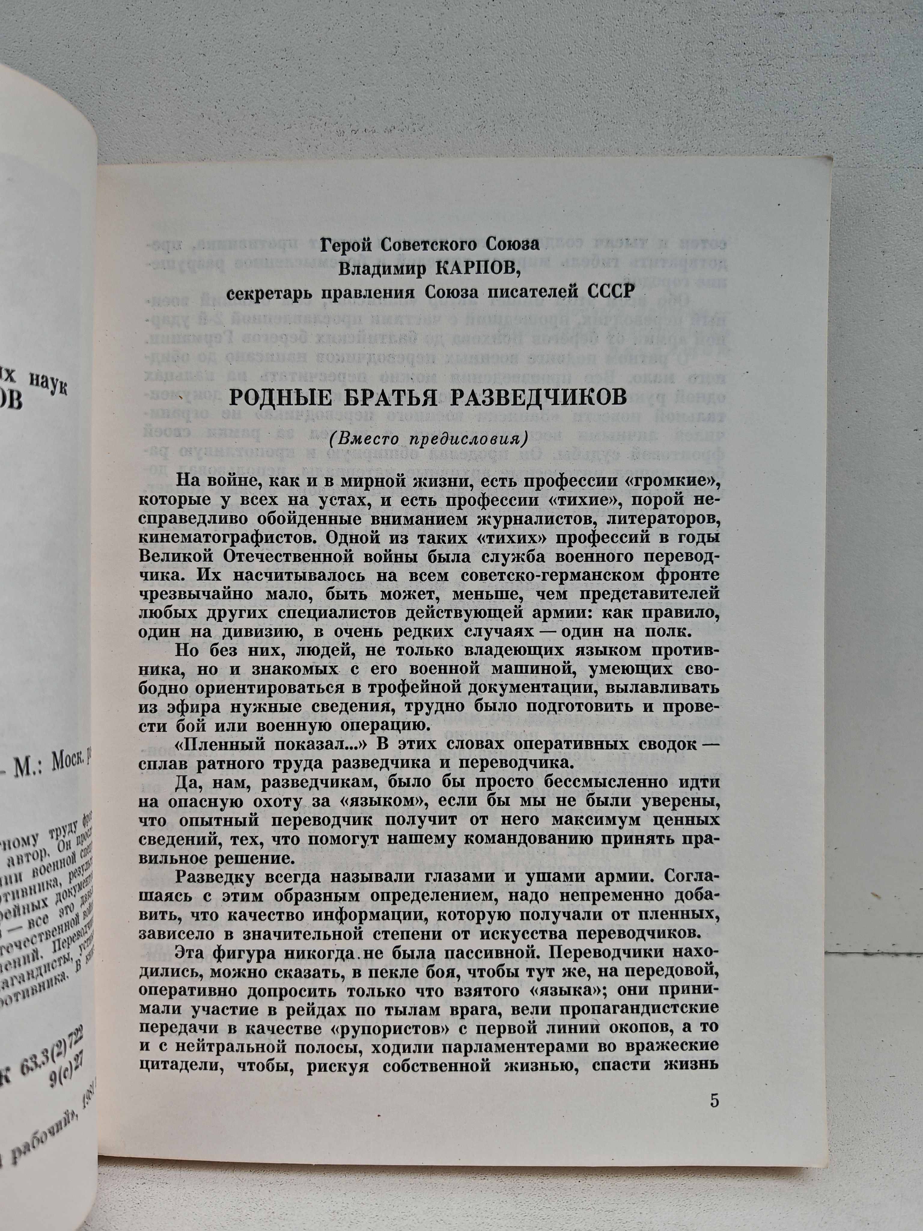 Документальная повесть посвящена ратному труду фронтовых переводчиков, одним из которых был автор. В книге прослеживается зарождение новой военной специальности в армии — военного переводчика. Описаны: — рейды с разведчиками в тыл противника; — результаты допросов пленных («языков»); — анализ трофейных документов, радиоперехватов и телефонных переговоров (источник ценных сведений для командования); — работа переводчиков как парламентеров и пропагандистов (деморализация противника устным словом и листовками). В книге публикуются фотоматериалы из архивов. Предназначена для массового читателя.