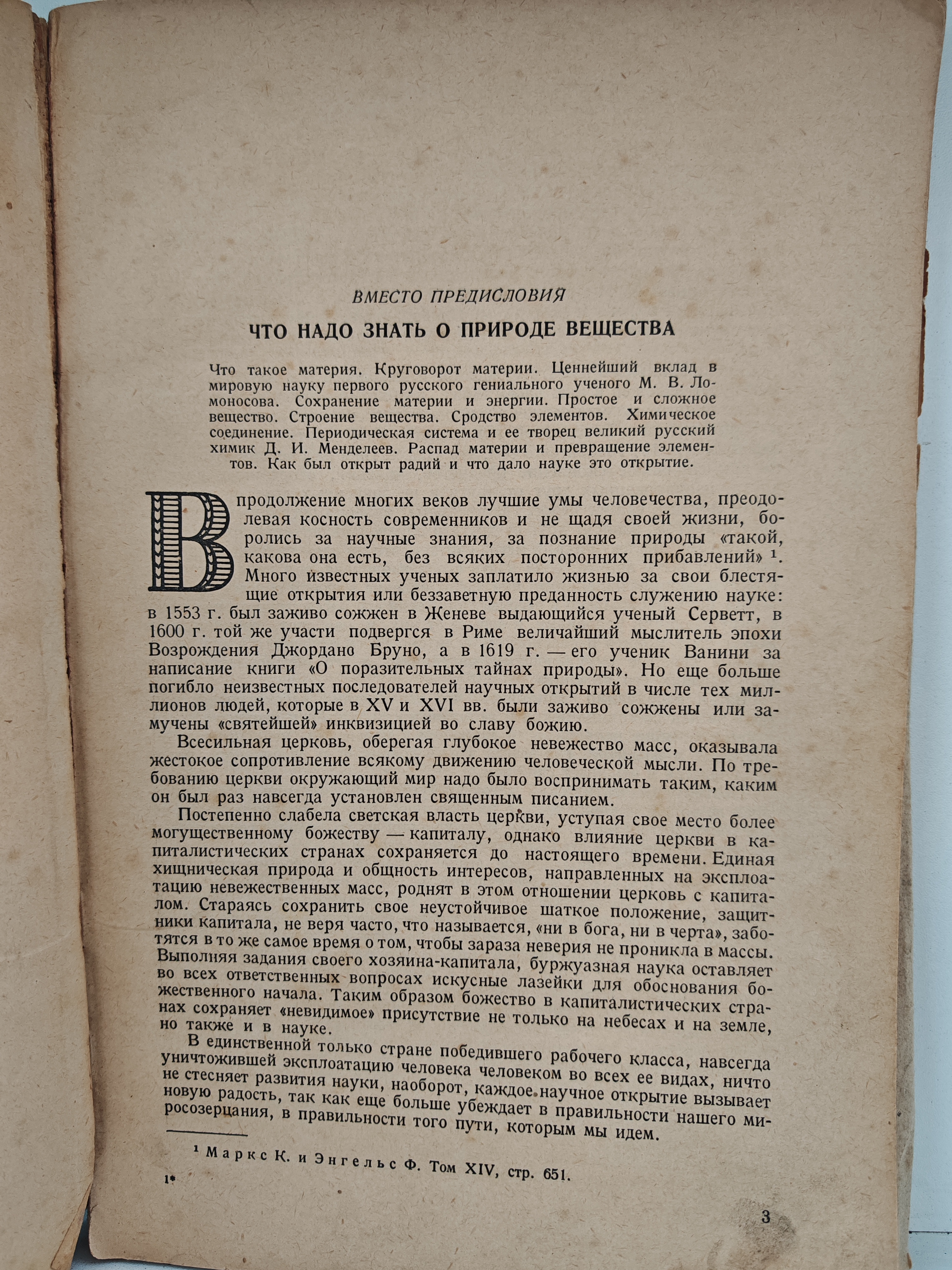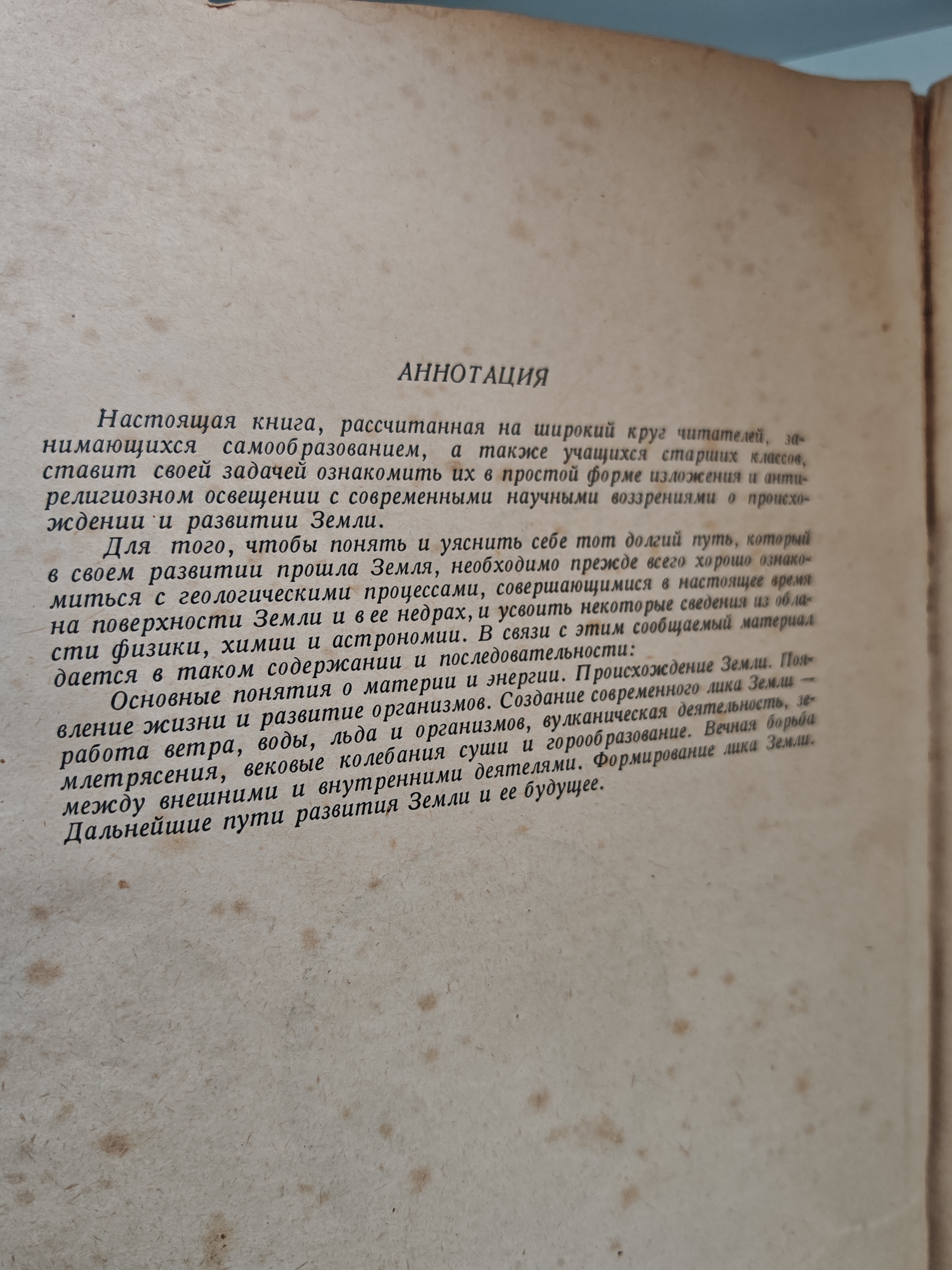 Книга знакомит читателей (в том числе учащихся старших классов) с современными научными воззрениями о происхождении и развитии Земли в простой форме изложения и в антирелигиозном освещении. Охвачены темы: — основные понятия о материи и энергии; — происхождение Земли; — строение и состав Земли; — геологические процессы (вулканизм, движения земной коры, землетрясения и др.); — появление жизни и развитие организмов; — формирование современного лика Земли (действие ветра, воды, льда); — борьба внешних и внутренних сил Земли; — перспективы развития и будущее планеты. Содержит 174 иллюстрации, предметный и географический указатели, список рекомендуемой литературы.